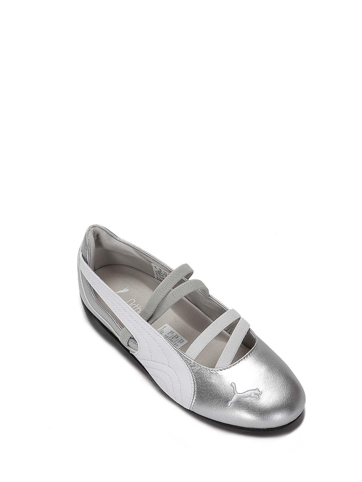 Ballerina aus metallischem Leder, elastische Riemen am Hals, geformter Lackstreifen, Logo an der Spitze.