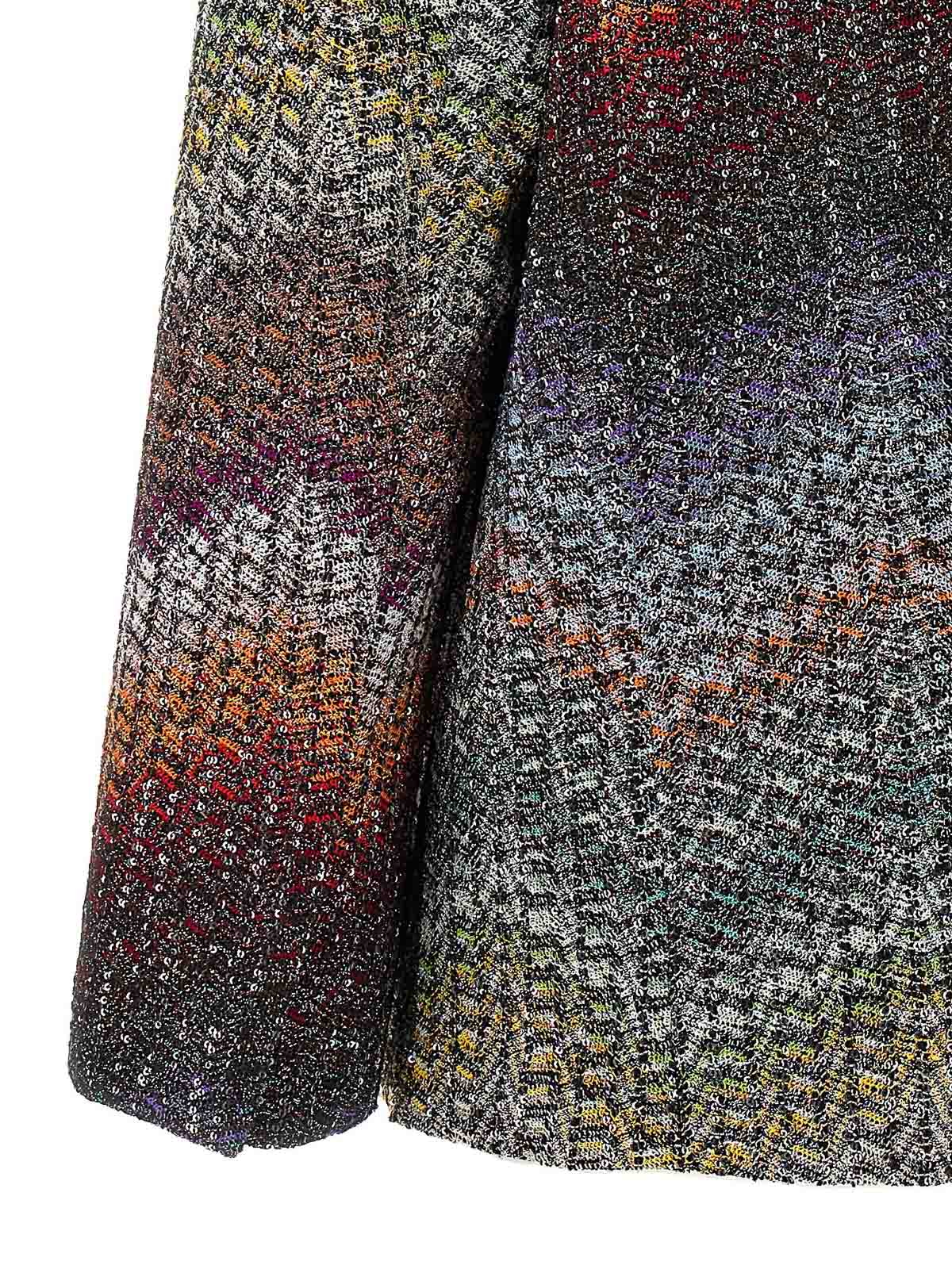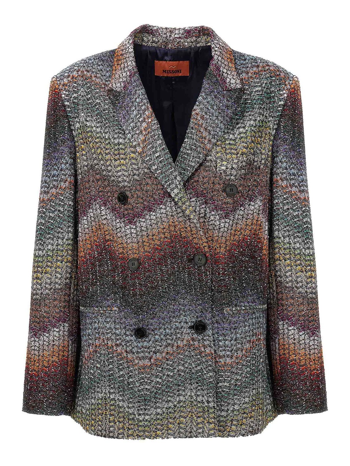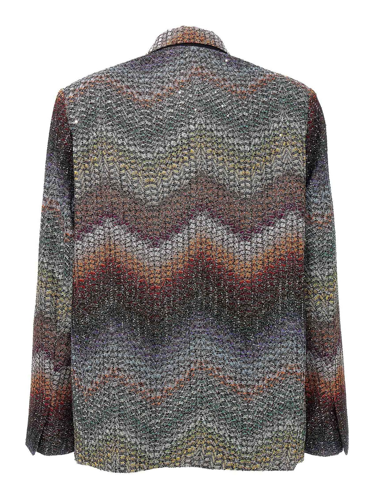 Zweireihiger Blazer Caperdoni aus durchgehender, paillettenbesetzter Viskose mit Zickzackmuster, Knopfverschluss auf der Vorderseite, Spitzenrevers, Brusttasche, aufgesetzte Taschen, strukturierter Schultergurt, lange Ärmel, Viskosefutter.
