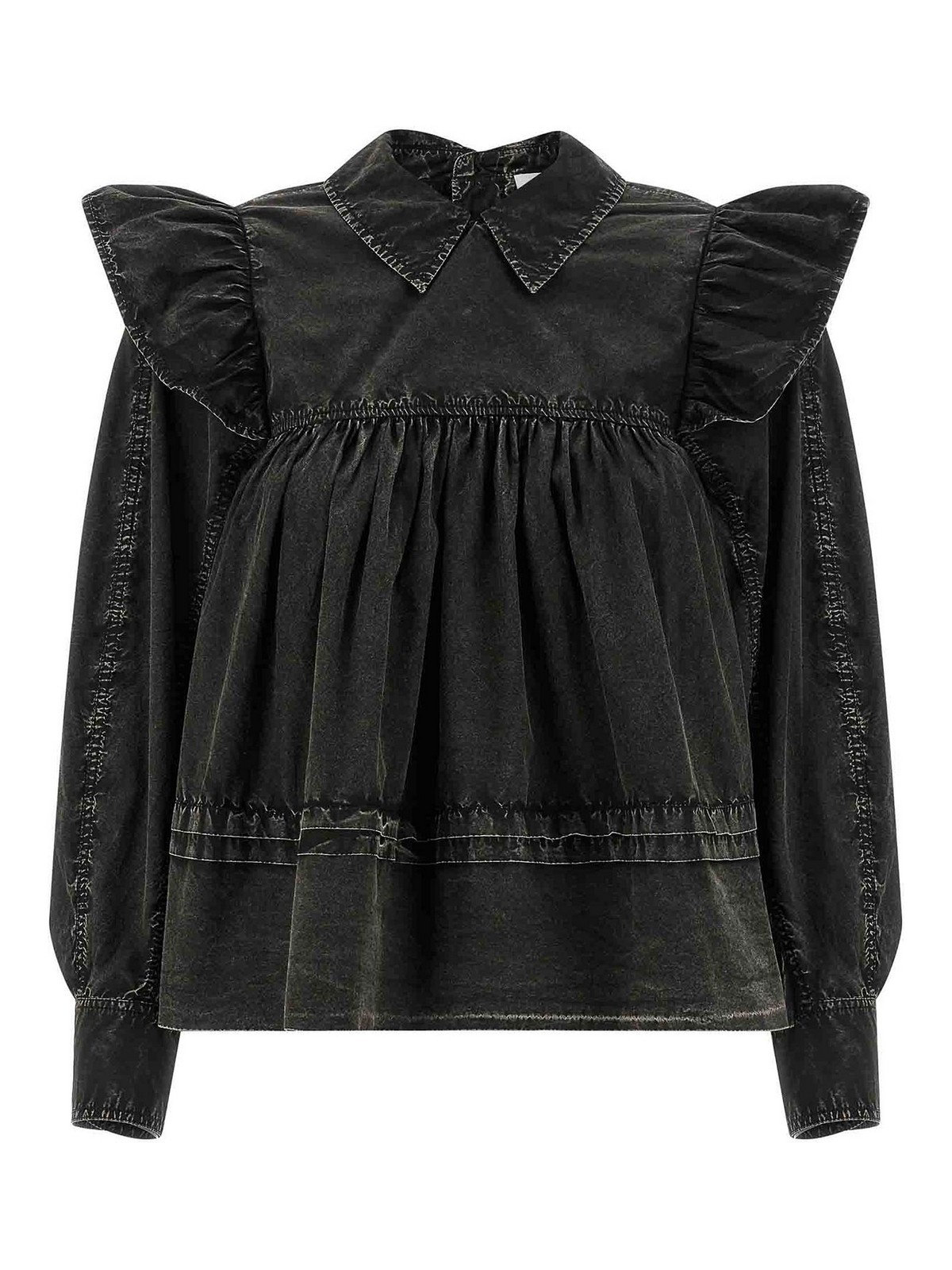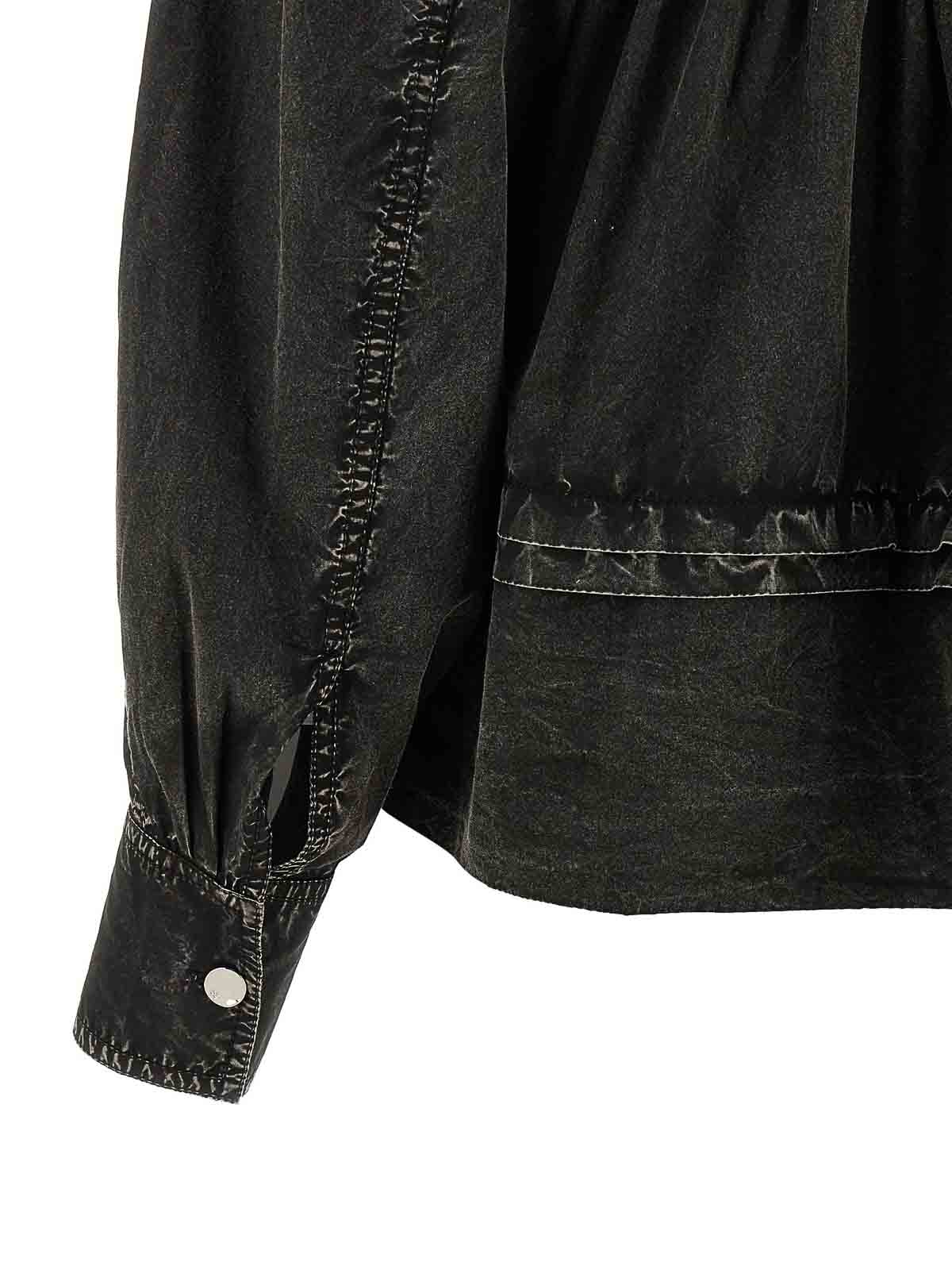 schwarze Bluse aus gewaschener Baumwolle mit Rüschen, gefärbt in einem Kleidungsstück mit Dlav-Effekt, Modell mit Locken und Mini-Volants auf der Vorder- und Rückseite, lange weite Ärmel mit Manschetten und Maxi-Rüschen an der Schulter, Knopfverschluss hinten.