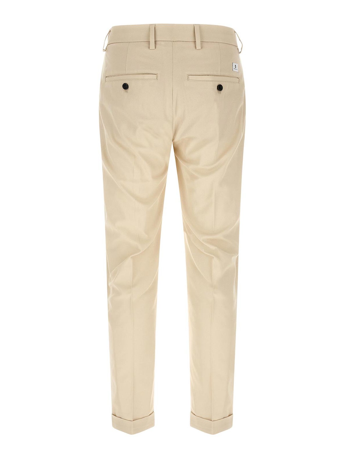 Destynais Chinohose aus Gabardine aus Crpe mit niedriger Taille, geradem Bein, Stretchfalte, Reißverschluss und Knopfverschluss auf der Vorderseite, amerikanischen Fronttaschen, Logo-Patch und Leistentaschen hinten, umgeschlagener Saum.