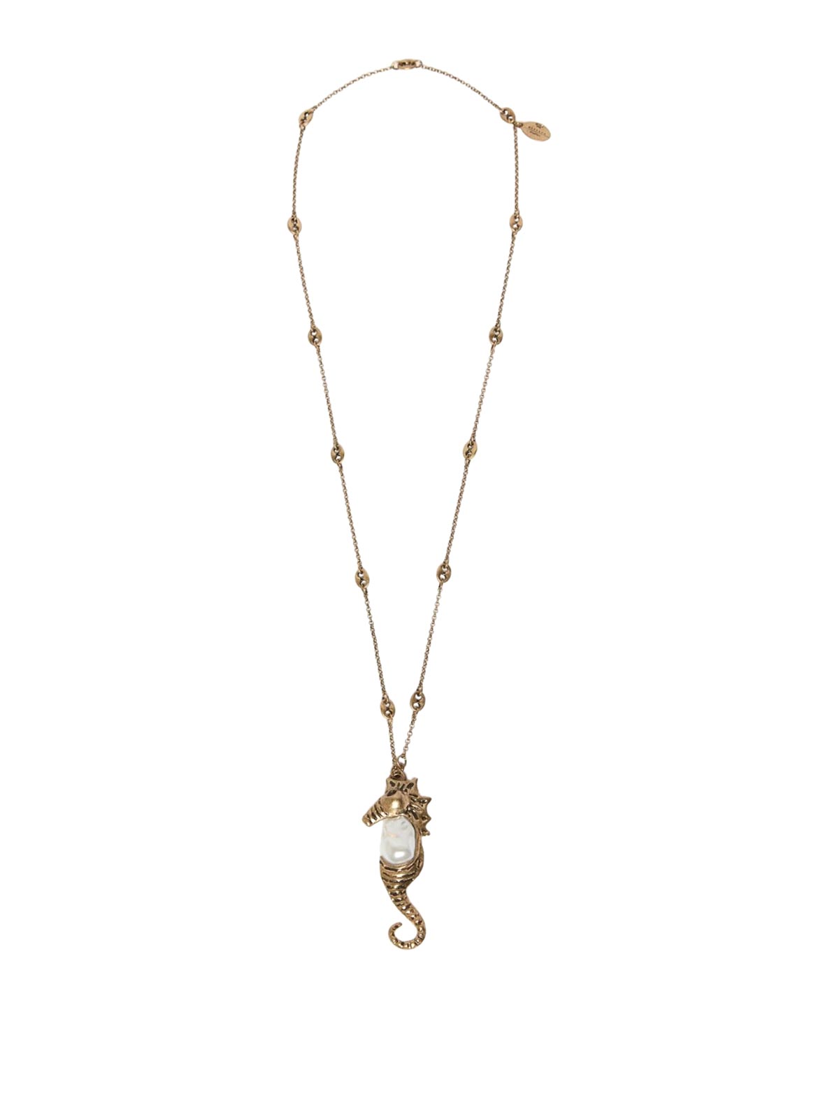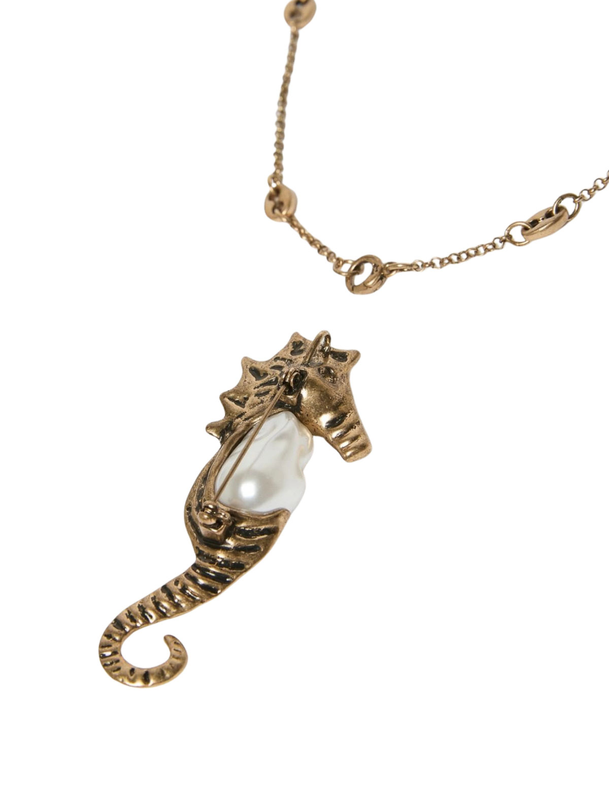Halskette aus Metall mit Anhänger und Brosche in Seepferdchenform, Weekend Max Mara, Material: Metalllegierung mit goldener Oberfläche, Oberfläche mit dekorativem Element in Perlenoptik, Farbe: Gold mit perlweißem Anhänger, Verschluss: Karabinerverschluss mit verstellbarer Kette, Details: dünne Kette mit kleinen dekorativen Elementen, Anhänger in Seepferdchenform mit zentraler Applikation in Perleffekt, der Anhänger, abnehmbar und als Brosche nutzbar, Logo auf dem letzten Etikett