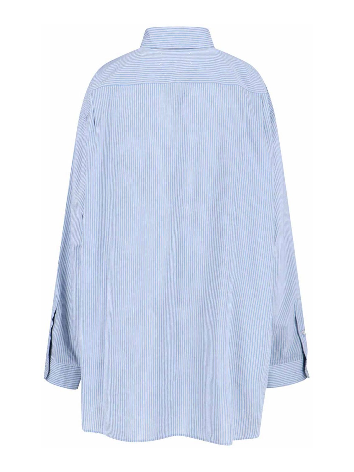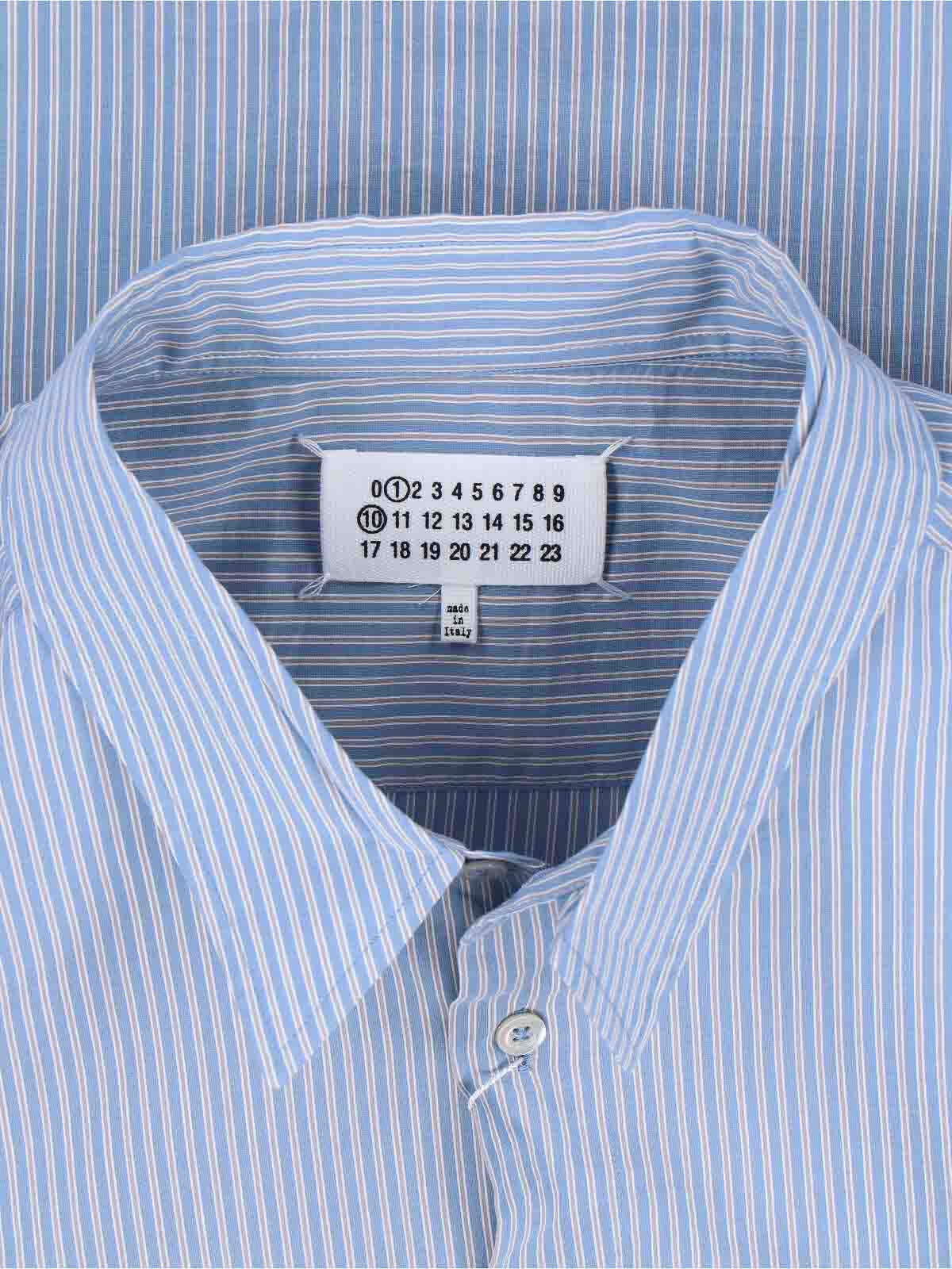 Gestreiftes Hemd von Maison Margiela aus Baumwolle und Seide, hellblau, klassischer Kragen, Knopfverschluss, lange Ärmel, geknöpfte Manschetten, geschwungener Saum.