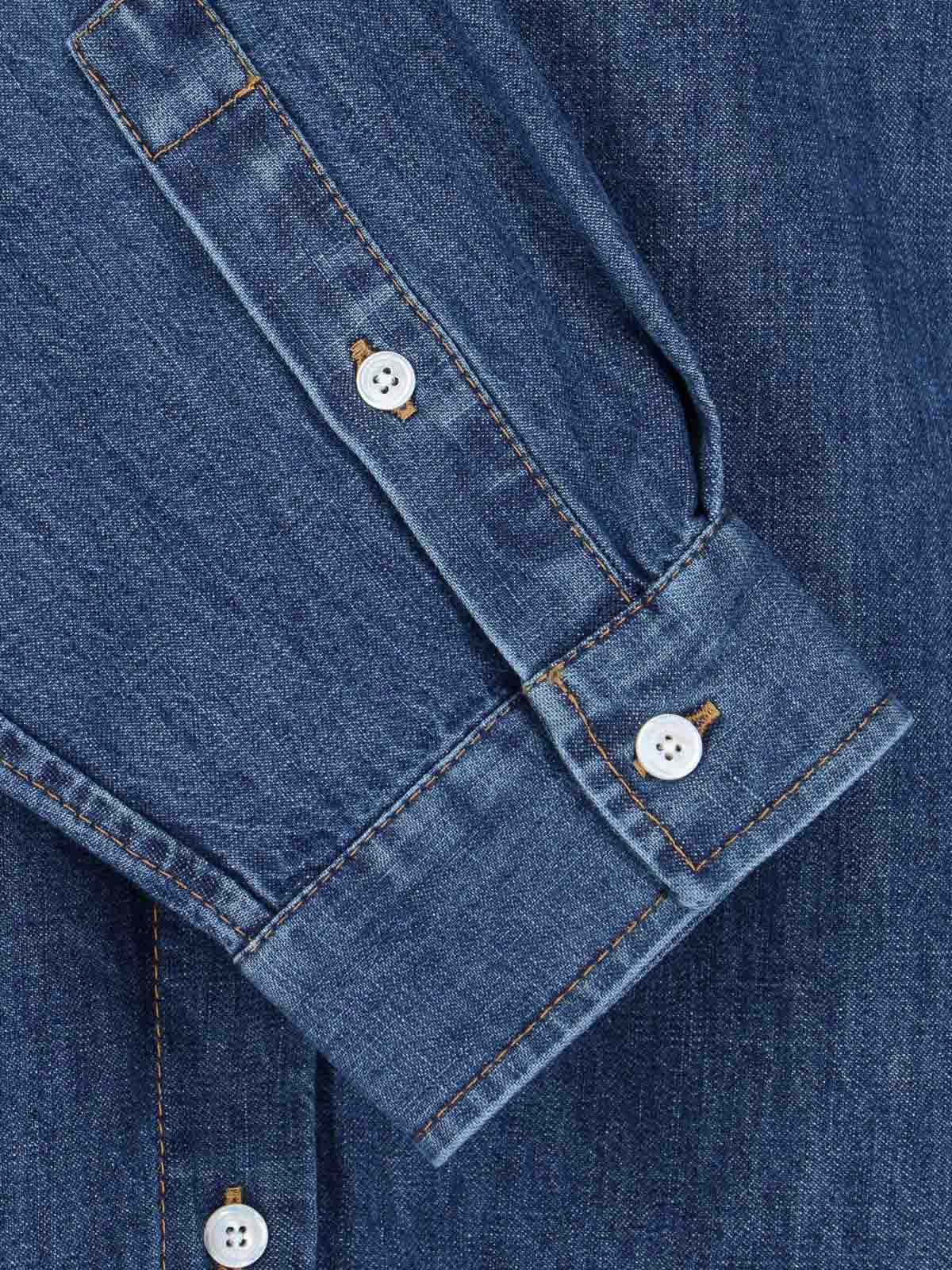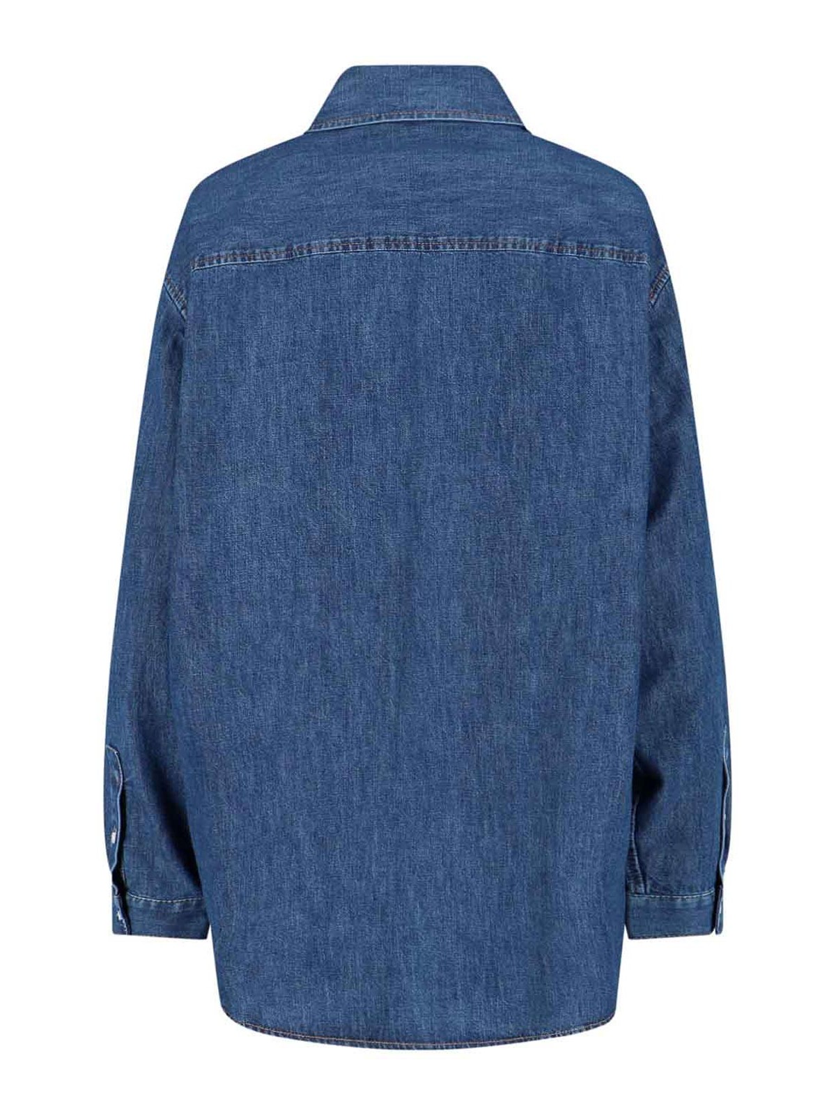 Goldhemd von Valentino aus blauem Baumwollchambray, klassischer Kragen, Knopfverschluss auf der Vorderseite, lange Ärmel, eine Fronttasche, V-Logo-Detail aus goldfarbenem Metall auf der Vorderseite, geschwungener Saum.