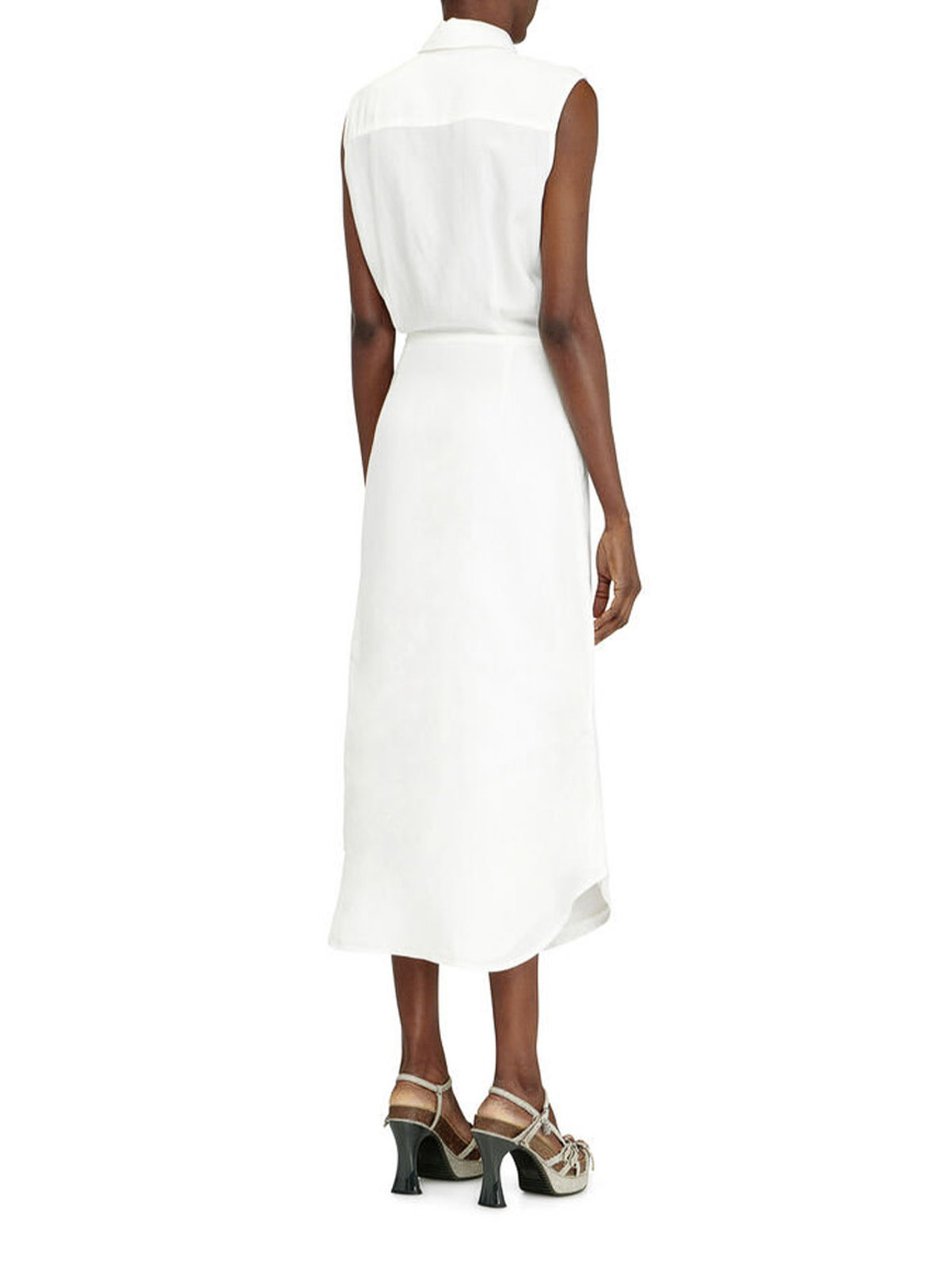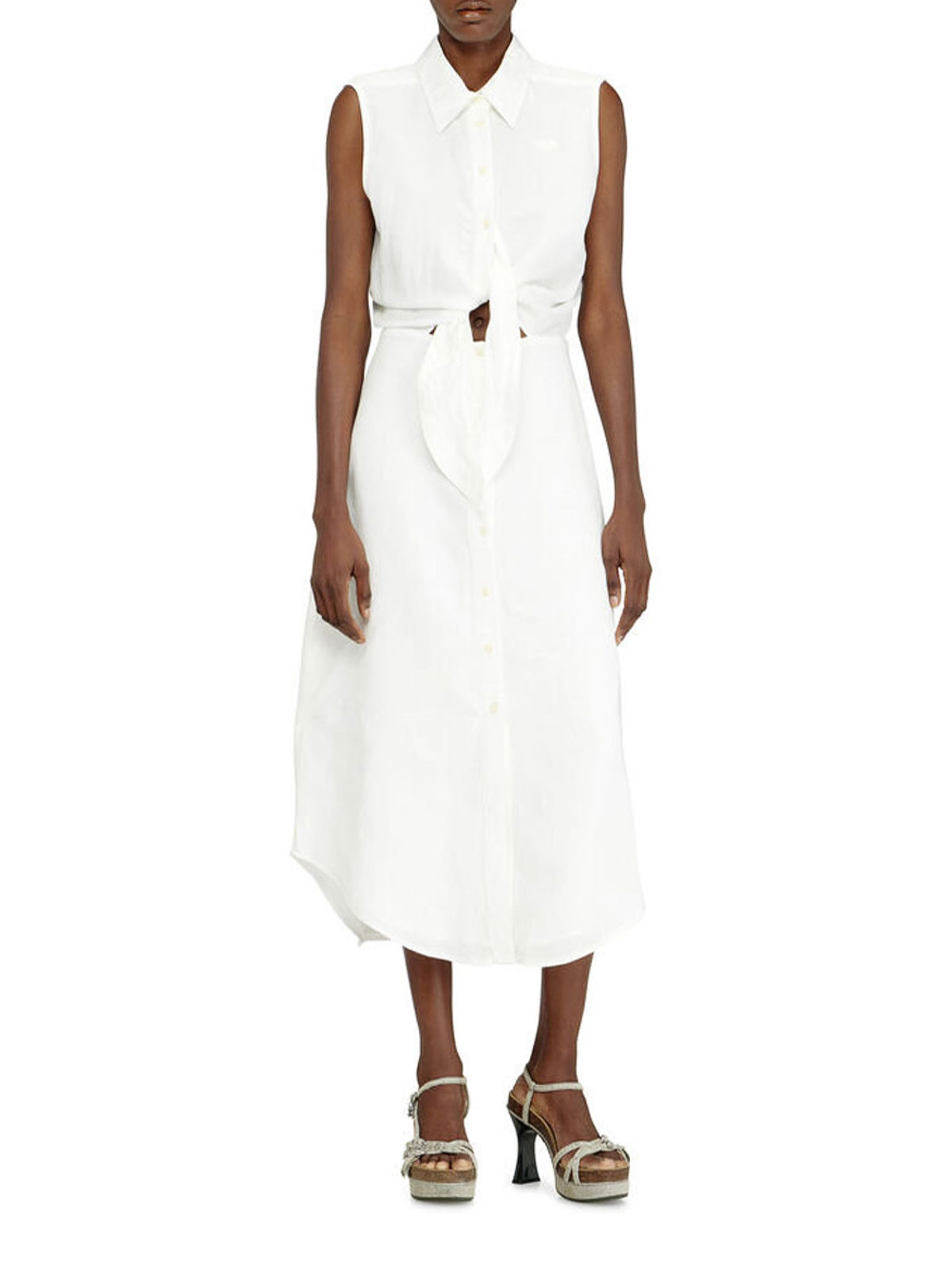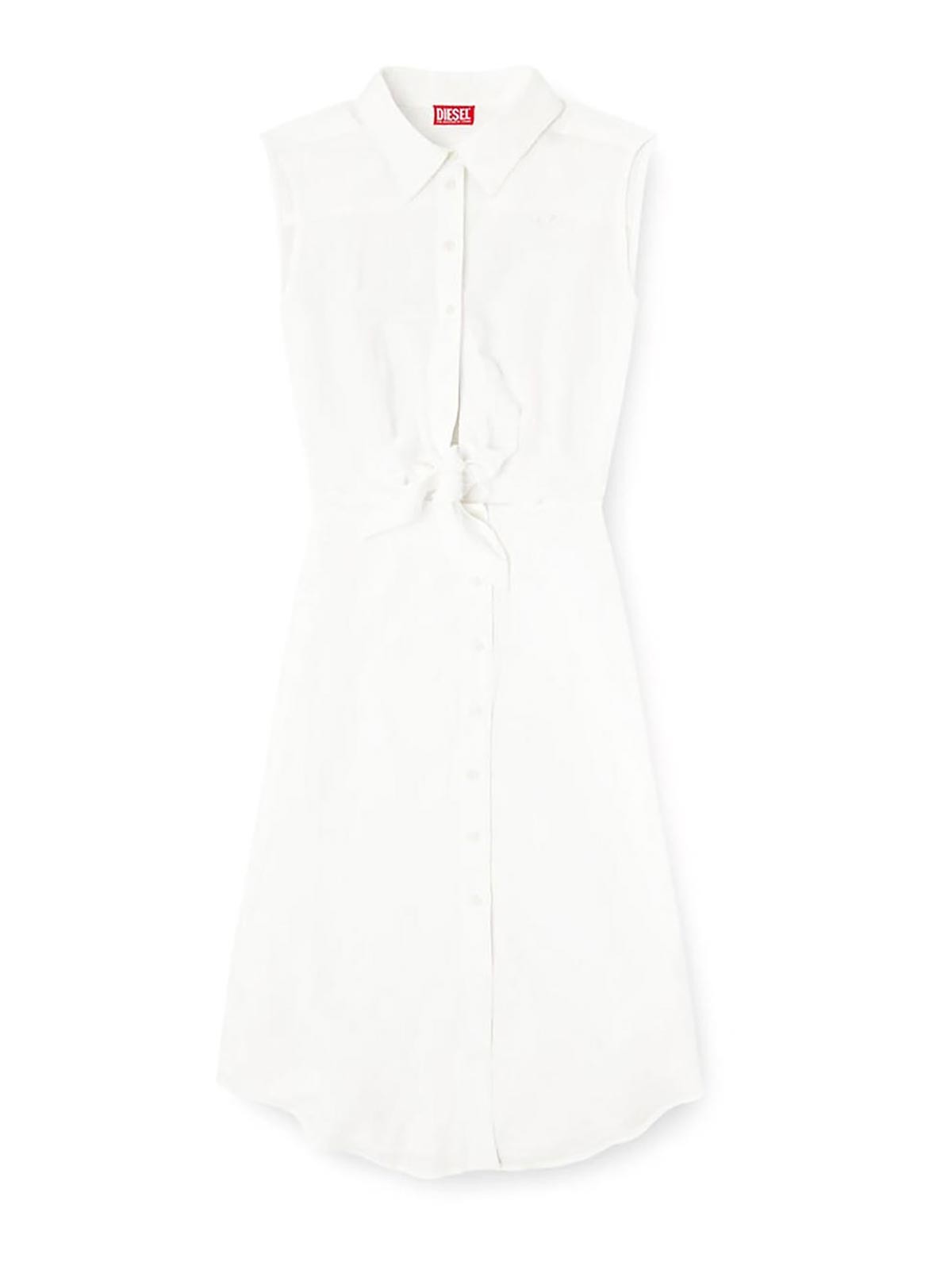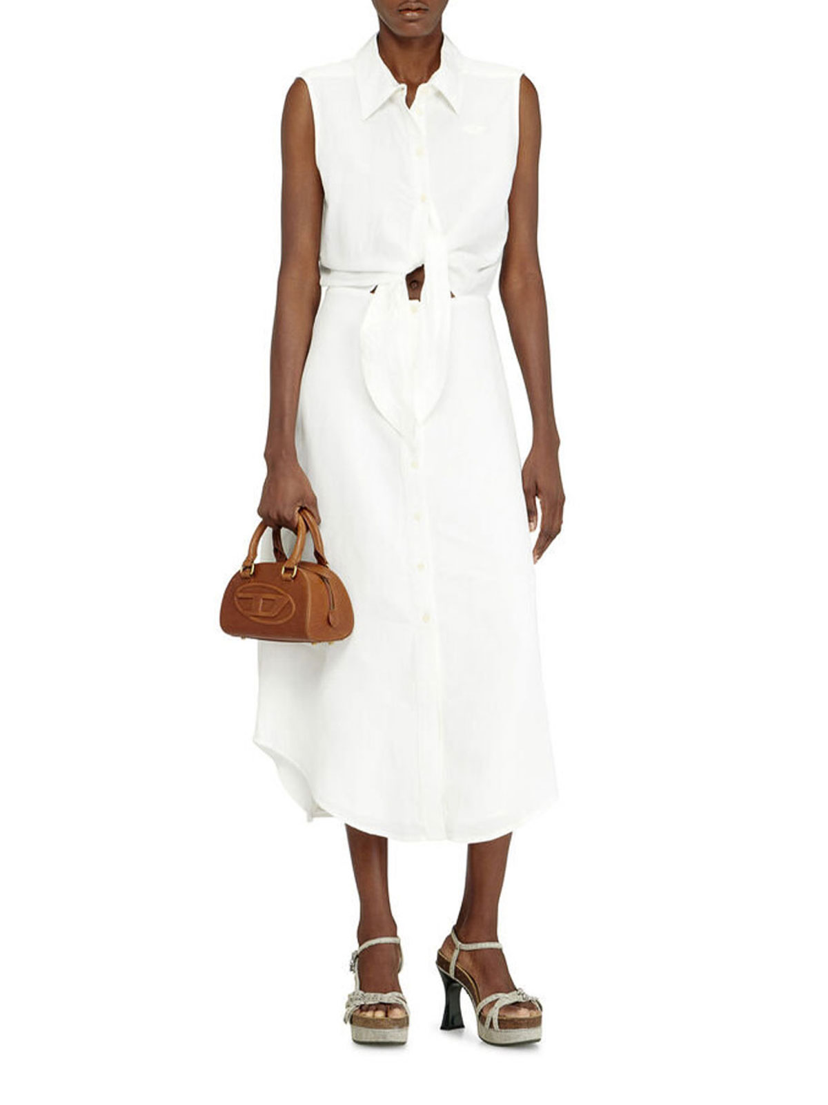 Das Diesel-Hemdkleid verfügt über ein ärmelloses Oberteil im Hemdstil, das an der Taille gebunden wird und mit einem fließenden, mittellangen Rock kombiniert wird. Hergestellt aus einer leichten, atmungsaktiven Mischung aus Modal, verantwortungsvoll gewonnener Viskose und Leinen, die für eine weiche Oberfläche gefärbt wurde