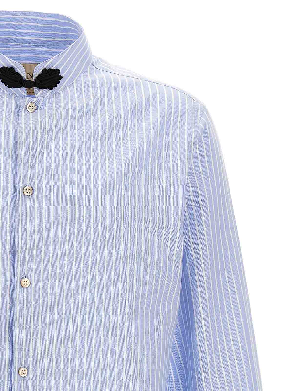 Gestreiftes Oxford-Baumwollhemd, mit mandarinfarbenem Kragen mit Froschverschluss, Knopfverschluss auf der Vorderseite, langen Manschettenärmeln, Seitenschlitzen.