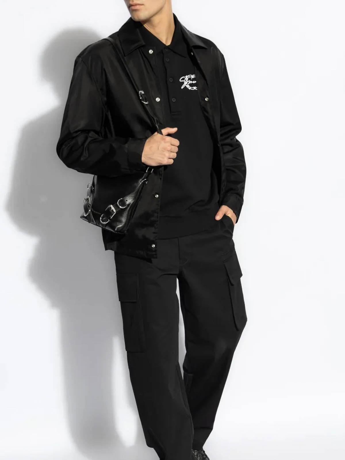 Schwarzer Designer mit Druckknopf und klassischem Kragen, langen Ärmeln und geradem Saum