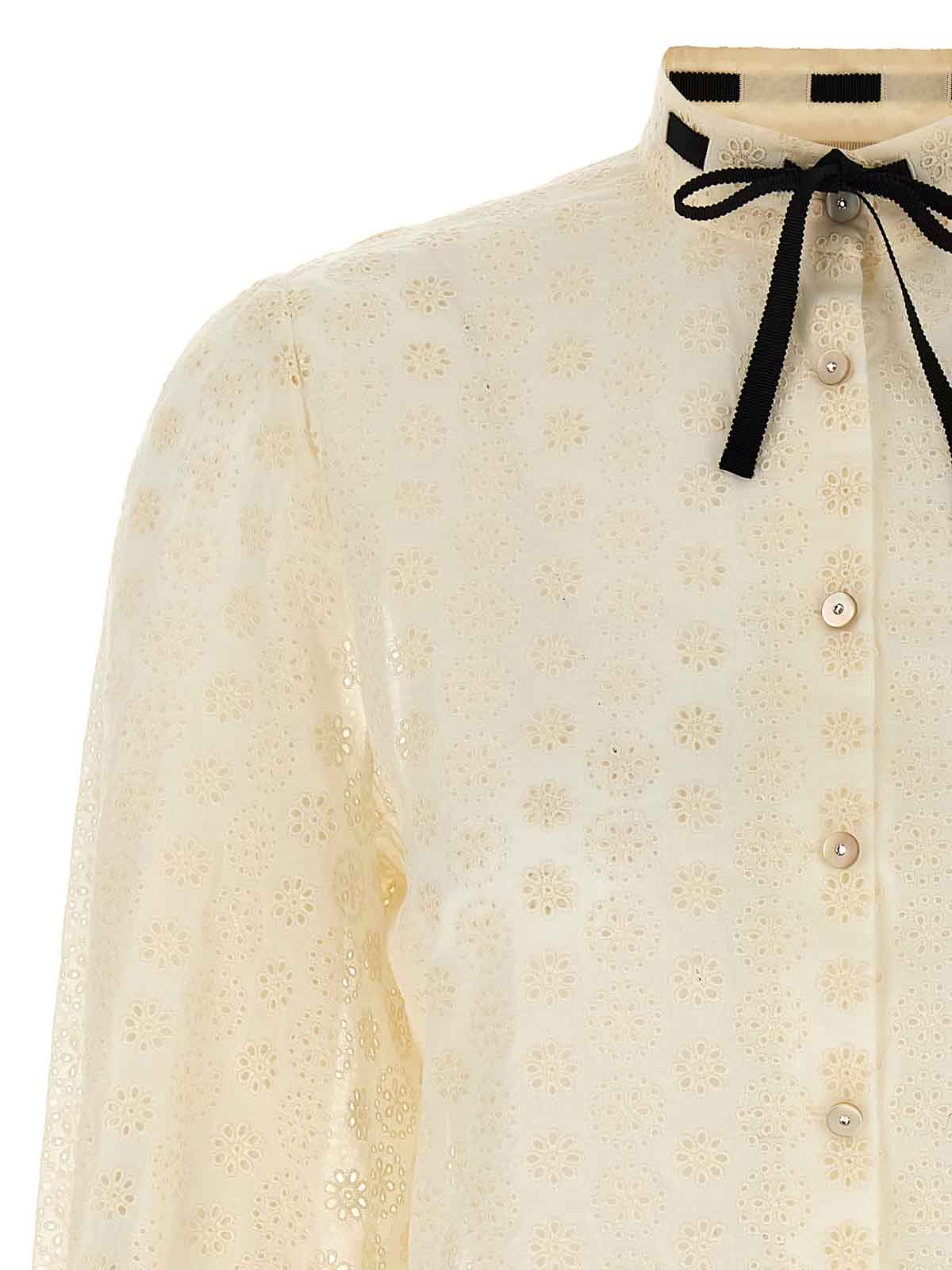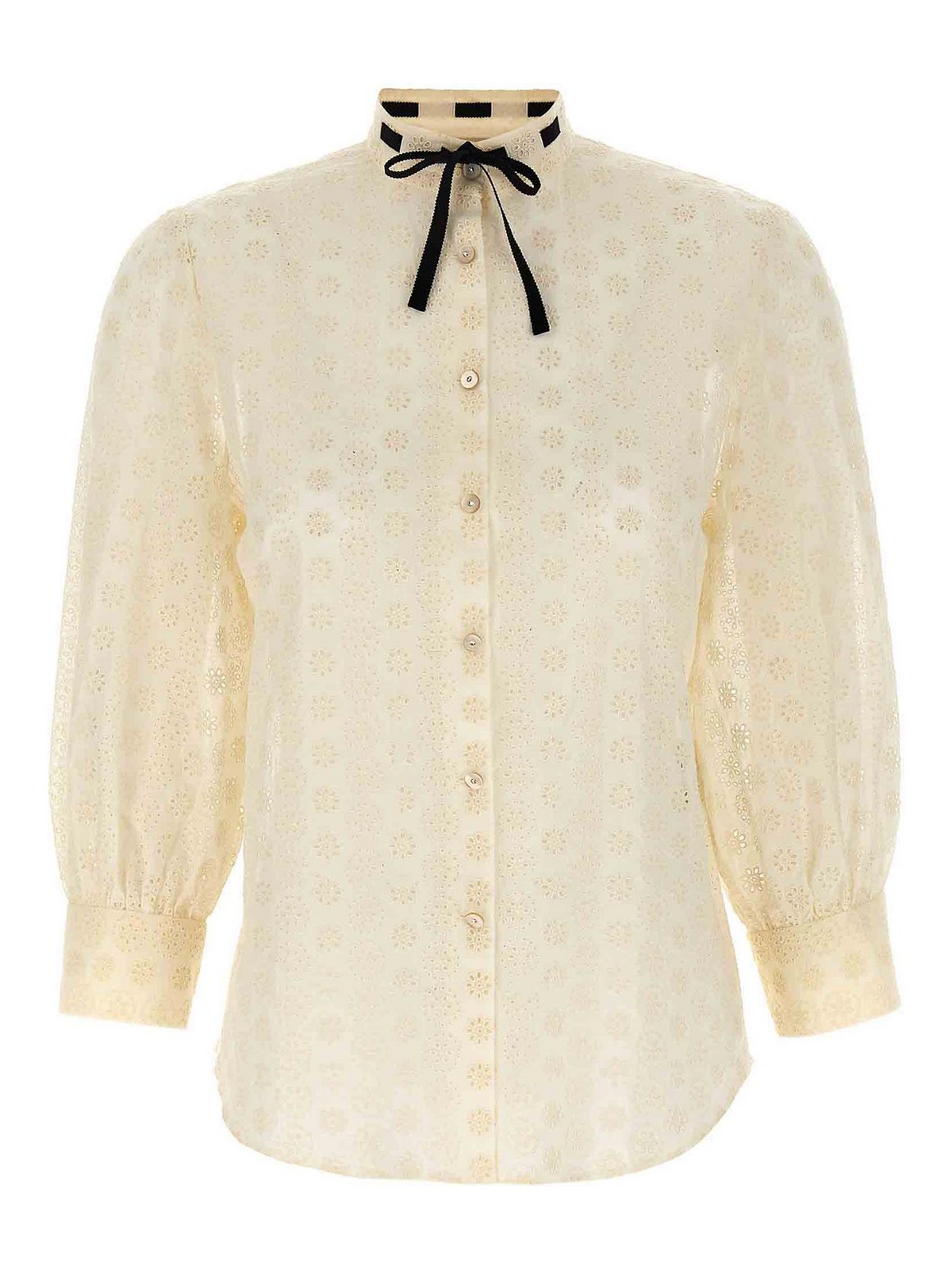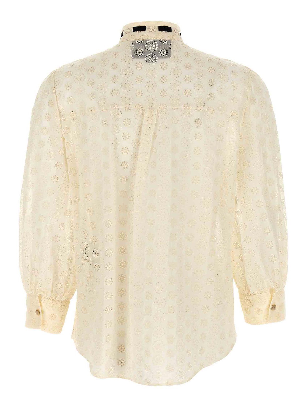 Gepunktetes Hemd aus Gänseblümchen-Sangallo, mandarinfarbener Kragen mit kontrastierendem Ripsband, Knopfverschluss mit Strasssteinen auf der Vorderseite, 3/4 weite Ärmel mit Manschetten.
