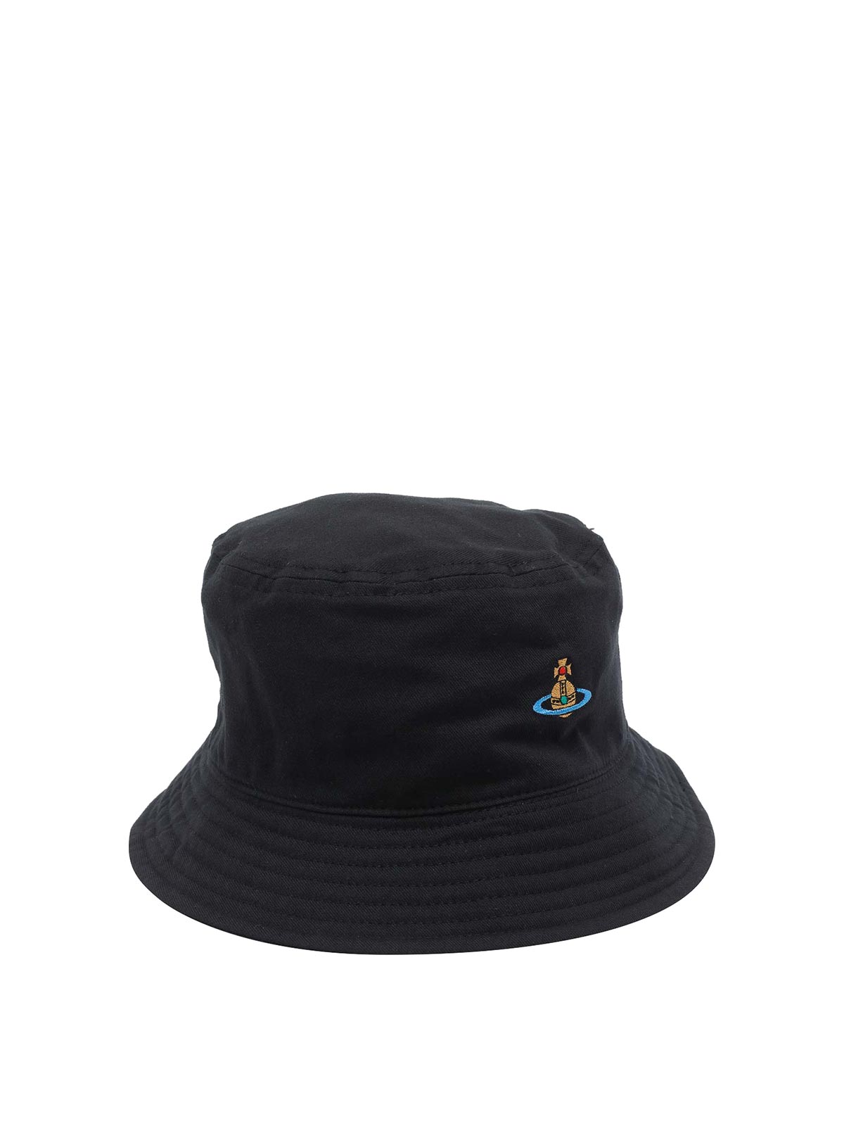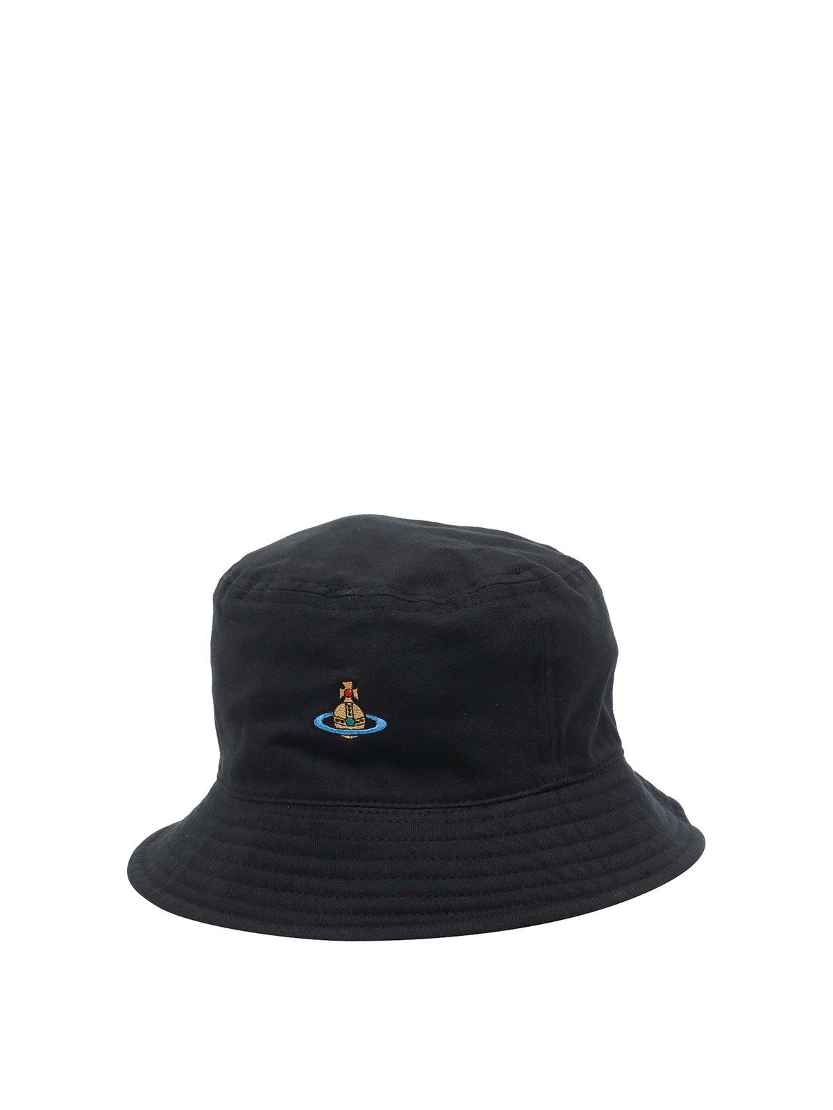Schwarzer, kugelförmiger Fischerhut von Vivienne Westwood, gesticktes Orb-Logo auf der Vorderseite