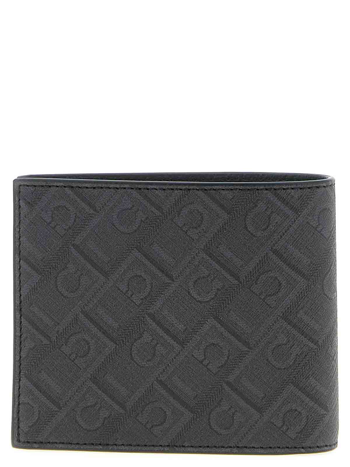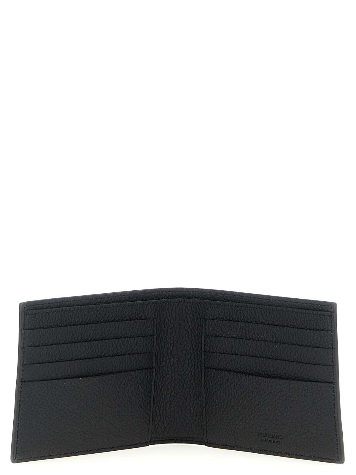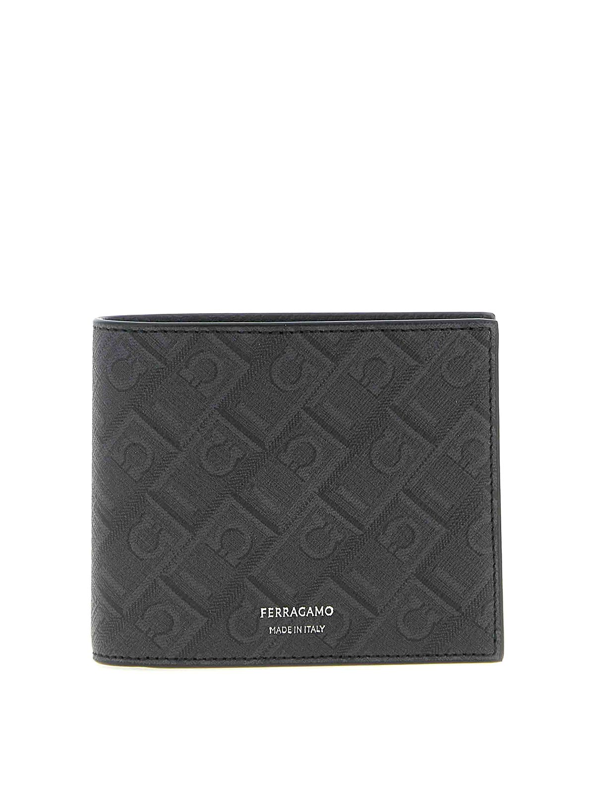 Brieftasche aus beschichtetem Stoff mit Ferragamo-Monogramm-Print, Innenfutter aus gehämmertem Kalbsleder, geprägtes Logo auf der Vorderseite und Buchöffnung.
