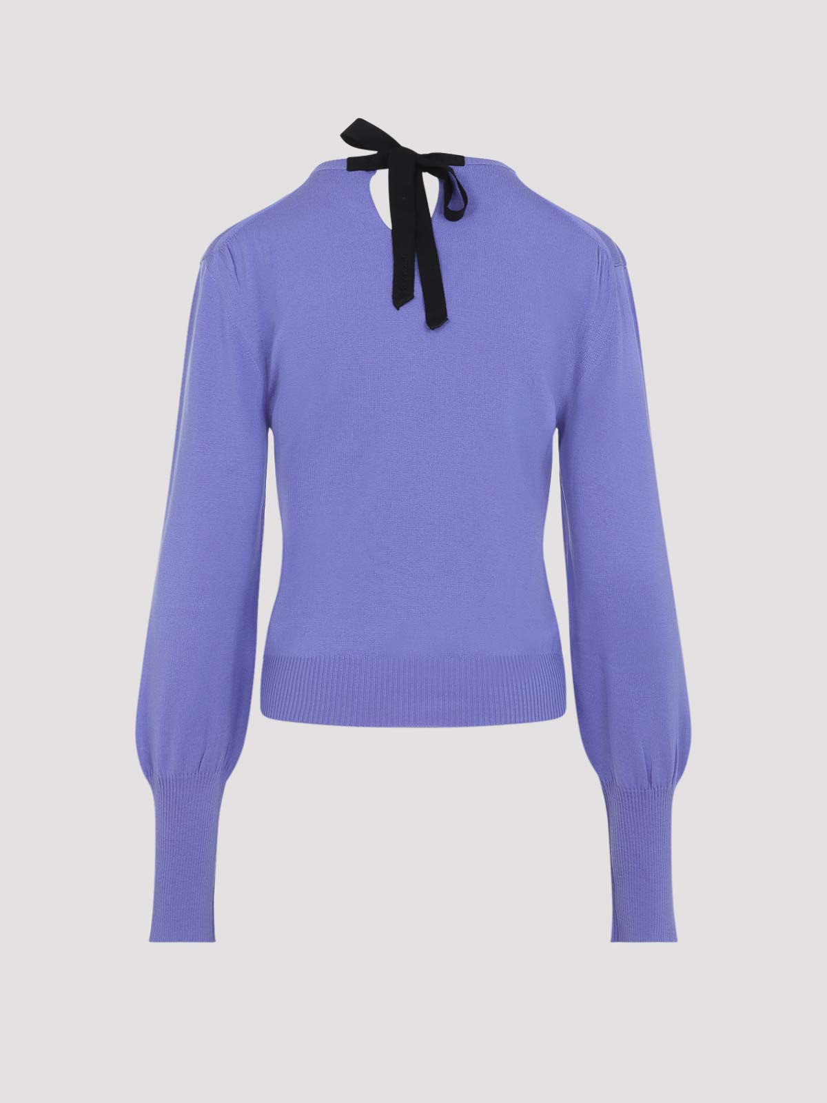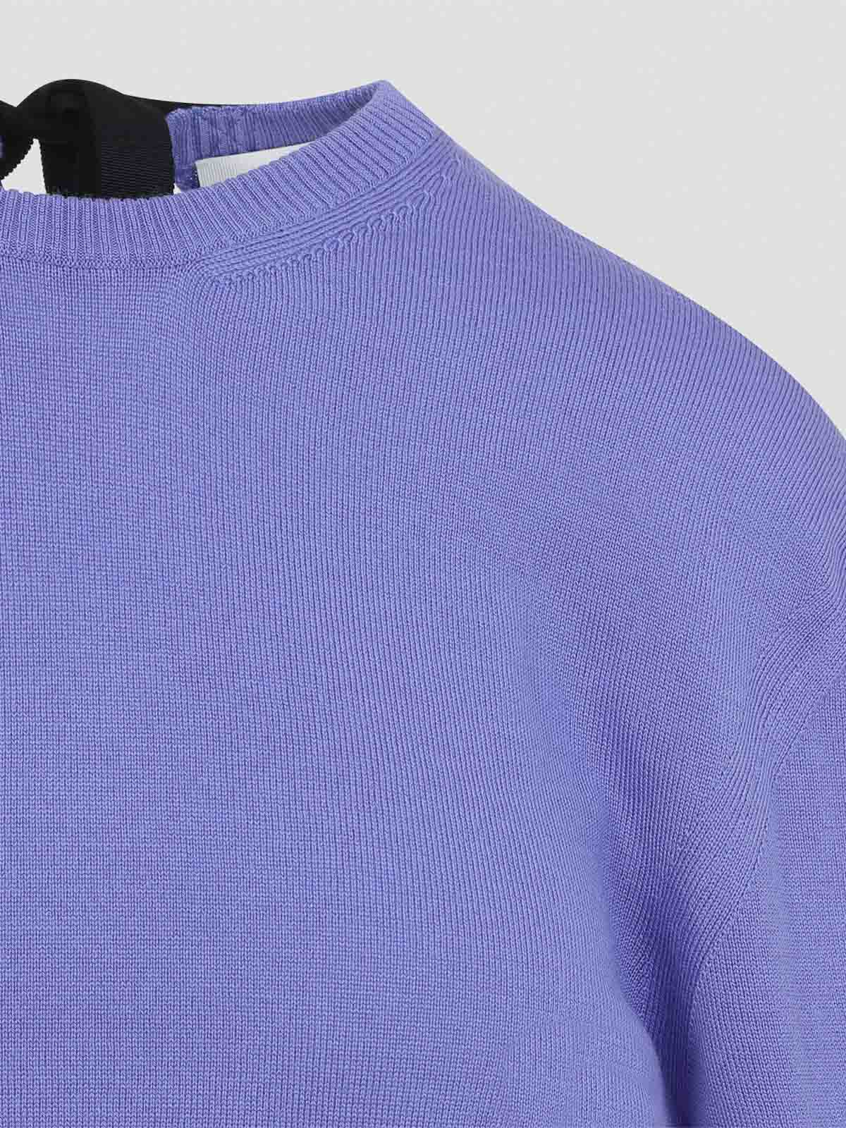 Lanvin Pullover aus Wolle mit Grobnarbendetail in Flieder. Hergestellt aus Wolle, Polyamid und Viskose, runder Rippkragen, kontrastfarbener schwarzer Riemenverschluss auf der Rückseite, lange Ärmel, gerippte Bündchen und Saum, gerader Saum.