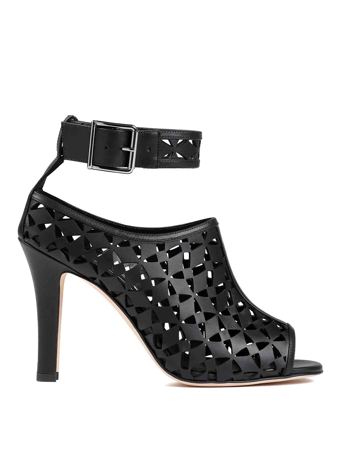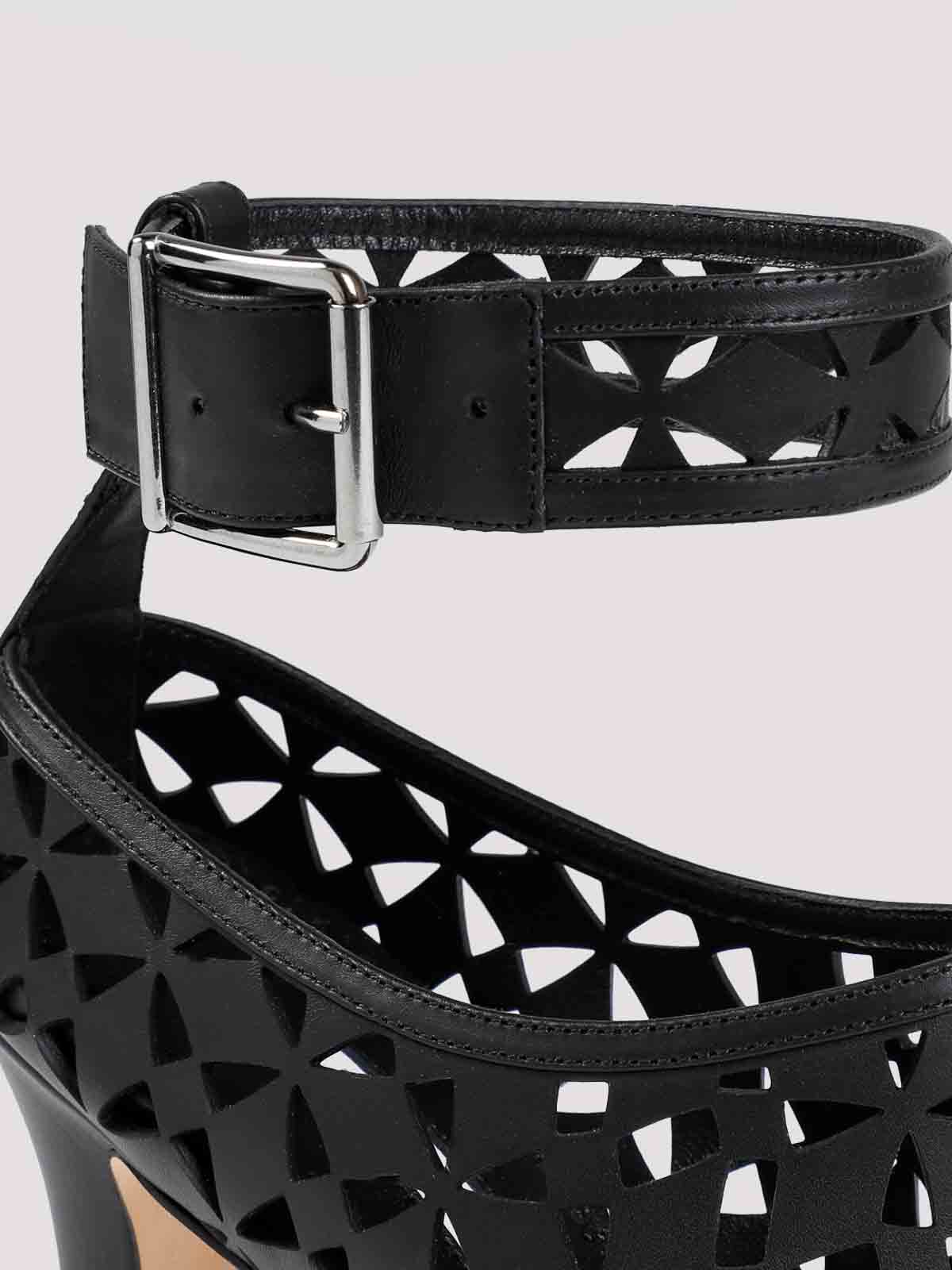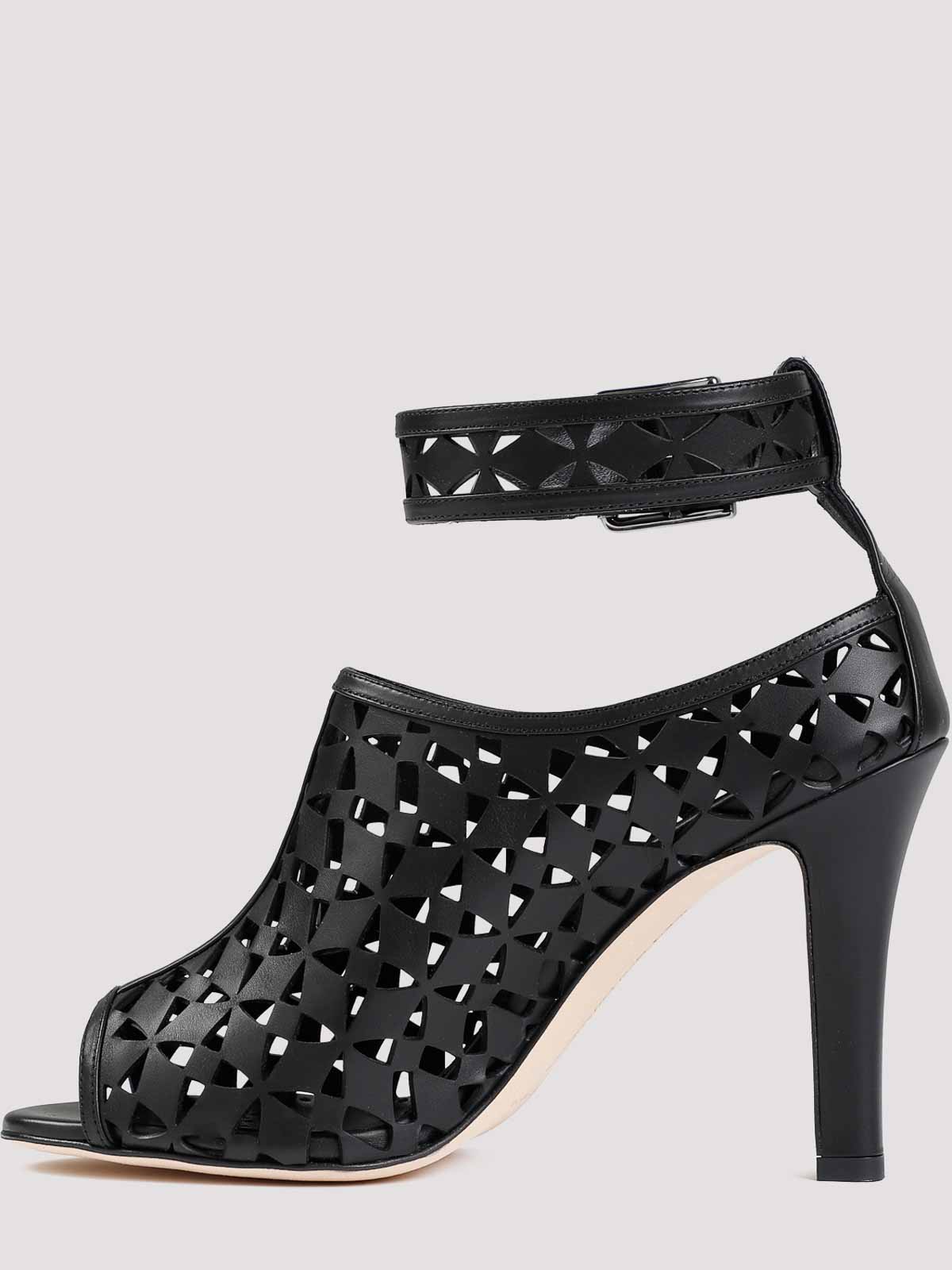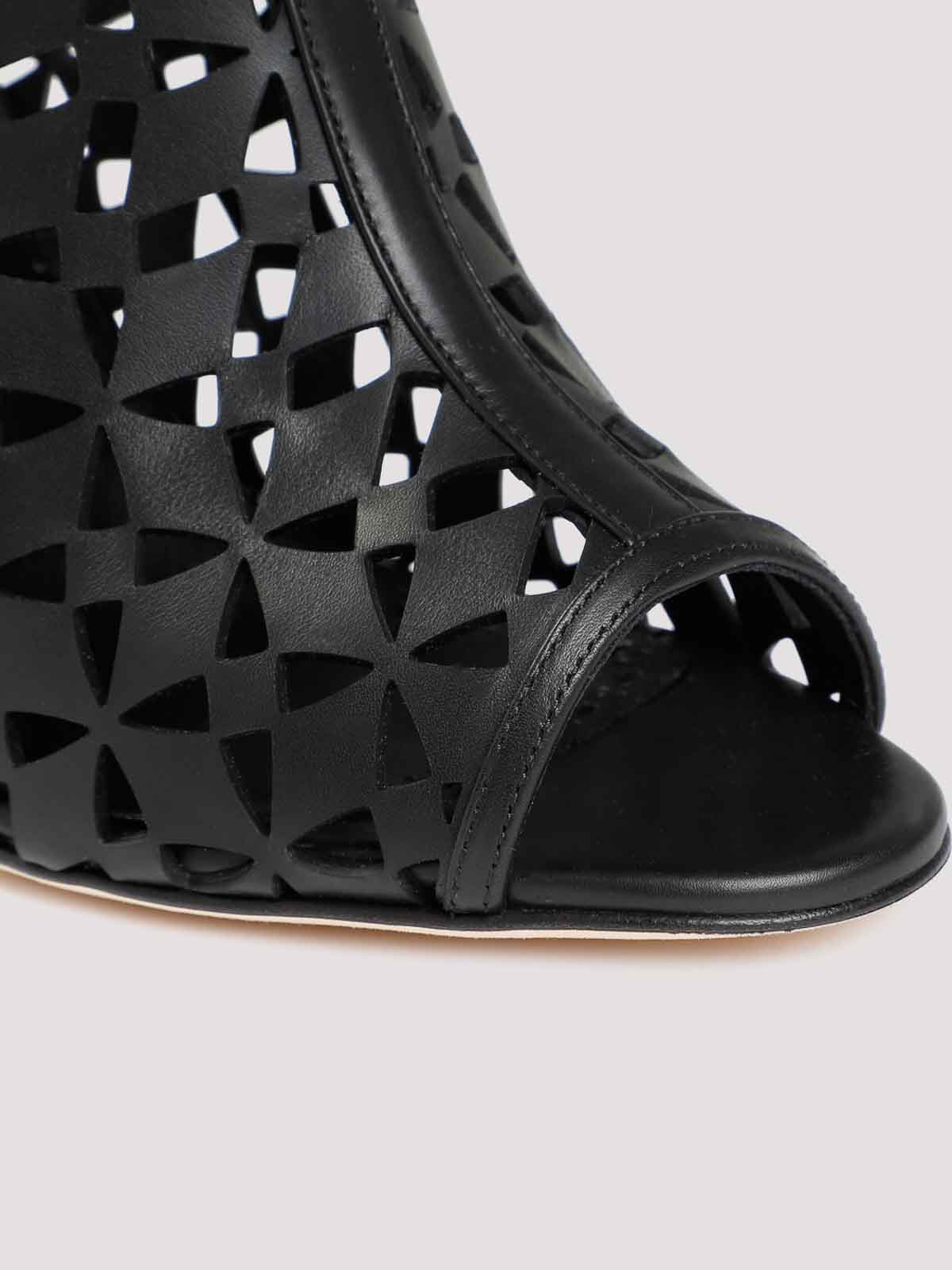 Manolo Blahnik Tingah 105 Sandalen aus Kalbsleder für Jugendliche. Hergestellt aus reinem Jugendkalbsleder, offene Zehenpartie, lasergeschnittene Details überall, Knöchelriemen mit Schnallenverschluss, schmal zulaufender Absatz, Innen- und Außensohle aus Leder.