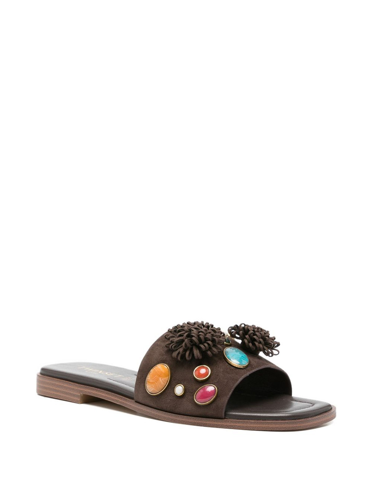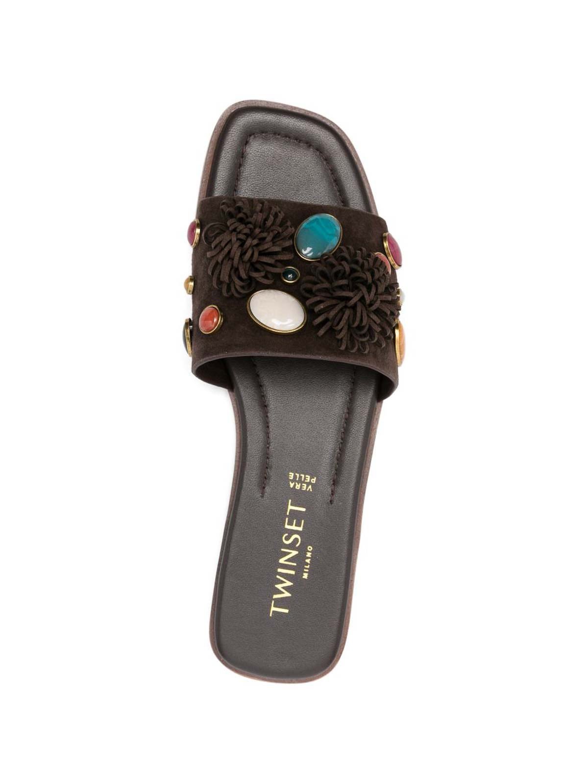 Leder-Slipper von Twinset, gefertigt aus braunem Leder und verziert mit applizierten Steinen. Feminines und raffiniertes Design, perfekt, um Sommerlooks einen leuchtenden und raffinierten Touch zu verleihen. Ein Stil, der Komfort, Qualität und die für die Marke typischen glamourösen Details vereint.