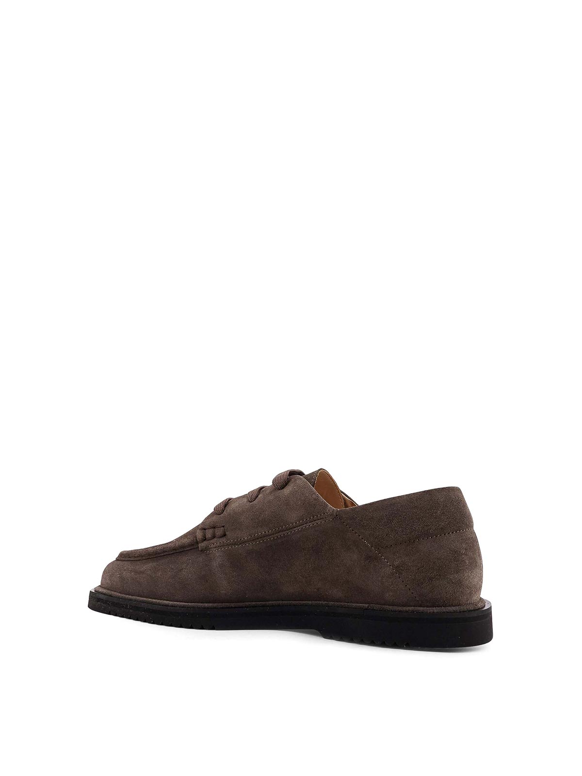 Quadratische Spitze, Schnürung, erhöhte Nähte, Gummisohle, Veloursleder.