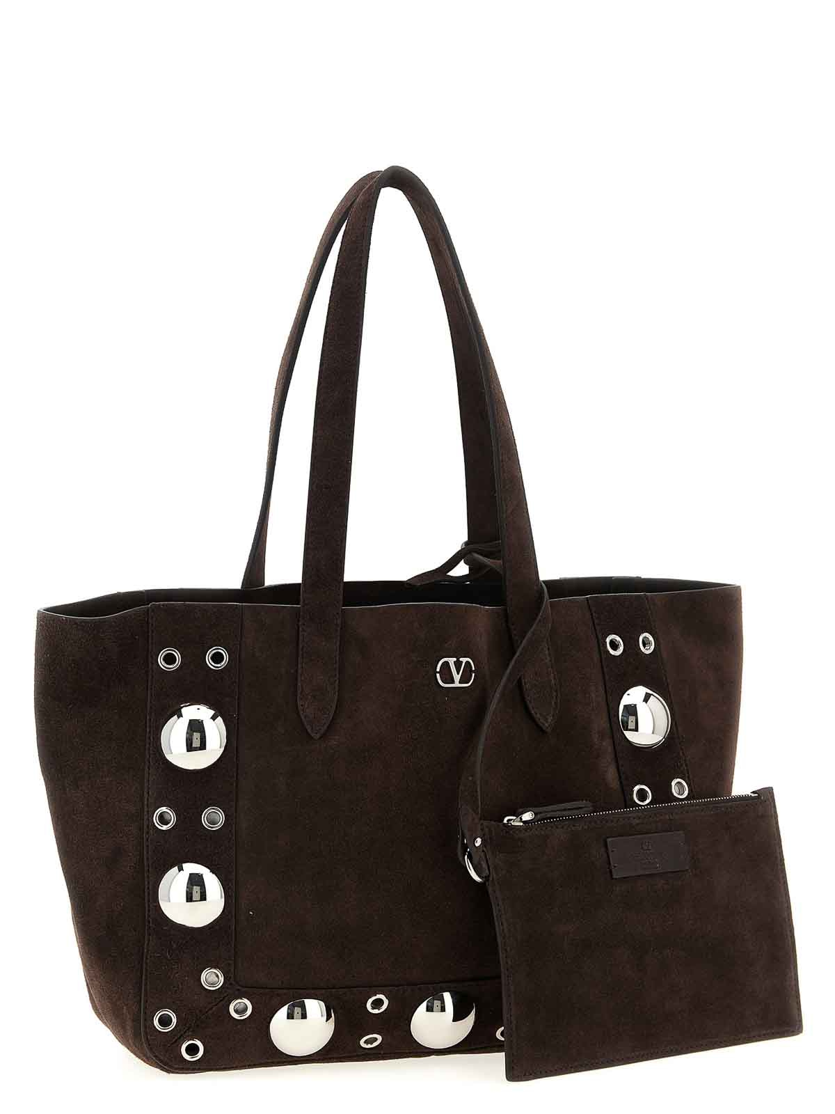 Mittelgroße Einkaufstasche aus Veloursleder „Nellcte“ mit einem Profil, das mit Kugelnieten und Nieten verziert ist, aus Metall mit Vlogo auf der Vorderseite, festem Doppelgriff und herausnehmbarer, passender Clutch.