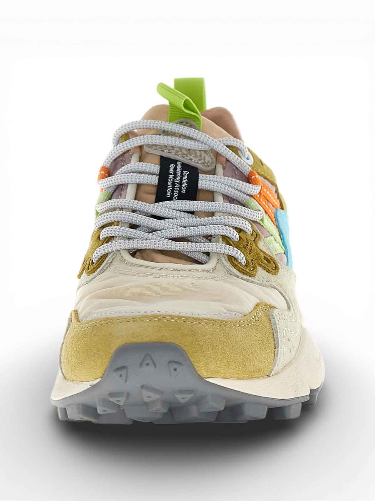 Flower Mountain, Yamano 3 Woman, Sneakers aus Veloursleder und technischem Gewebe, milchig-weiß-hellblau, Sneakers mit modernem Design, das Weiblichkeit und Outdoor-Attitüde vereint. Das Damenmodell Yamano 3 verfügt über ein Obermaterial aus technischem Gewebe mit Einsätzen aus mehrfarbigem Wildleder, das durch die ikonische, von der Löwenzahnblüte inspirierte Öse verstärkt wird. Die Schnürung mit Trekkingschnürsenkeln und verstärkten Ösen erinnert an die Trekkingwelt und garantiert Stabilität und Widerstandsfähigkeit. Die Innensohle aus natürlichem antibakteriellem Kork sorgt für Wohlbefinden und lang anhaltenden Tragekomfort. Die ultraleichte Gummisohle mit gezacktem Profil rundet das Design mit einem dynamischen und funktionellen Aufdruck ab., Obermaterial aus technischem Gewebe mit.mes hrfarbigen Wildledereinsätzen, ikonisch geformte Ösen, Trek-Schnürsenkel, Innensohle aus antibakteriellem Naturkork, ultraleichte Gummisohle mit Wellenschliff treten.