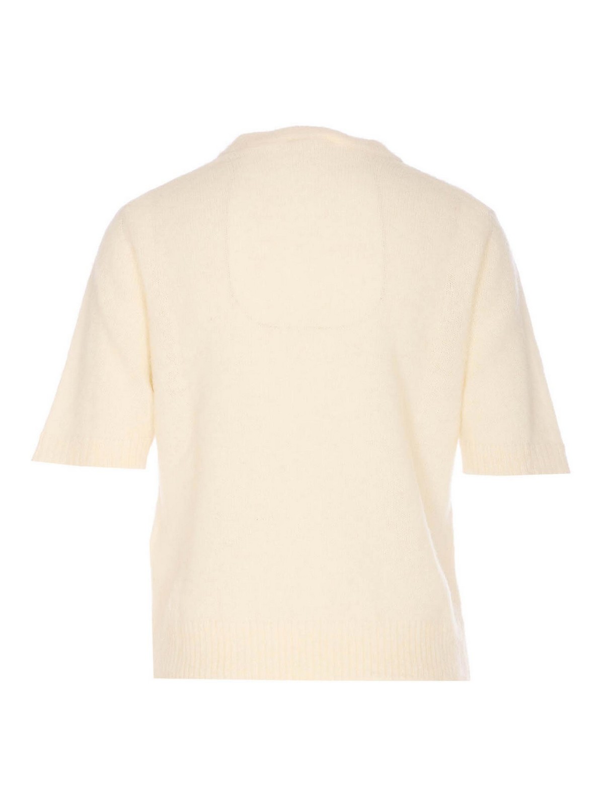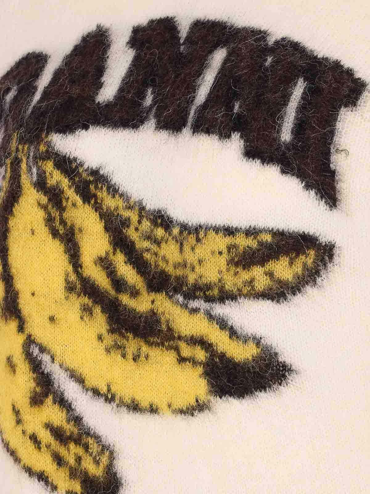 Weißes T-Shirt aus gebürstetem Alpaka von Ganni, Rundhalsausschnitt, Logo und Banane auf der Vorderseite