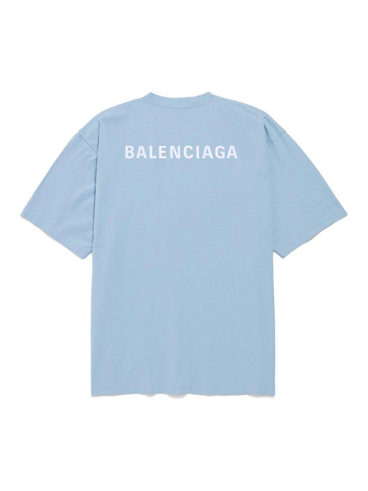 Designer-Farbe: hellblau-weiß, trockenes Jersey, Rundhalsausschnitt, kurze Ärmel, Balenciaga-Artwork-Stickerei auf der Vorder- und Rückseite.