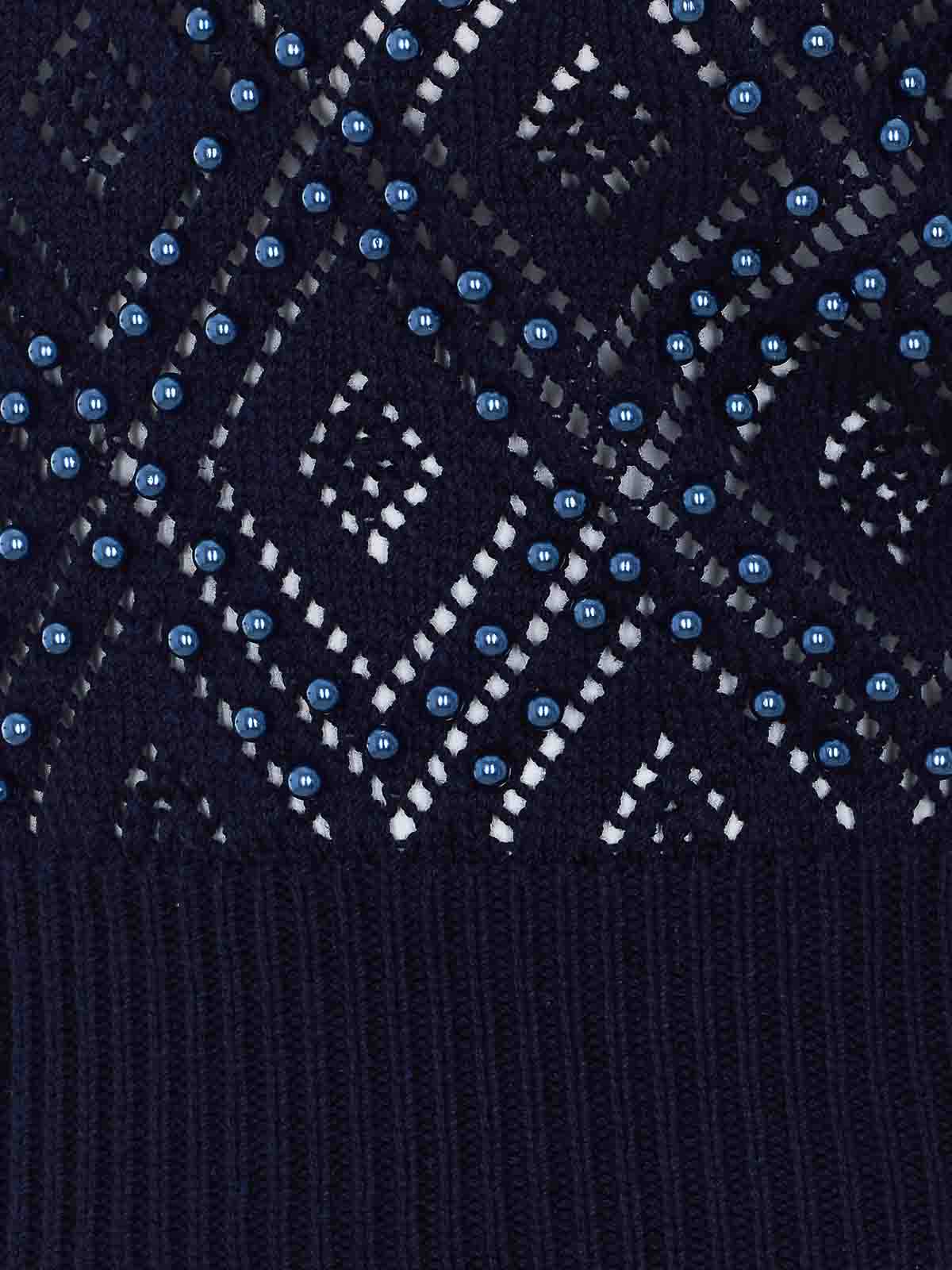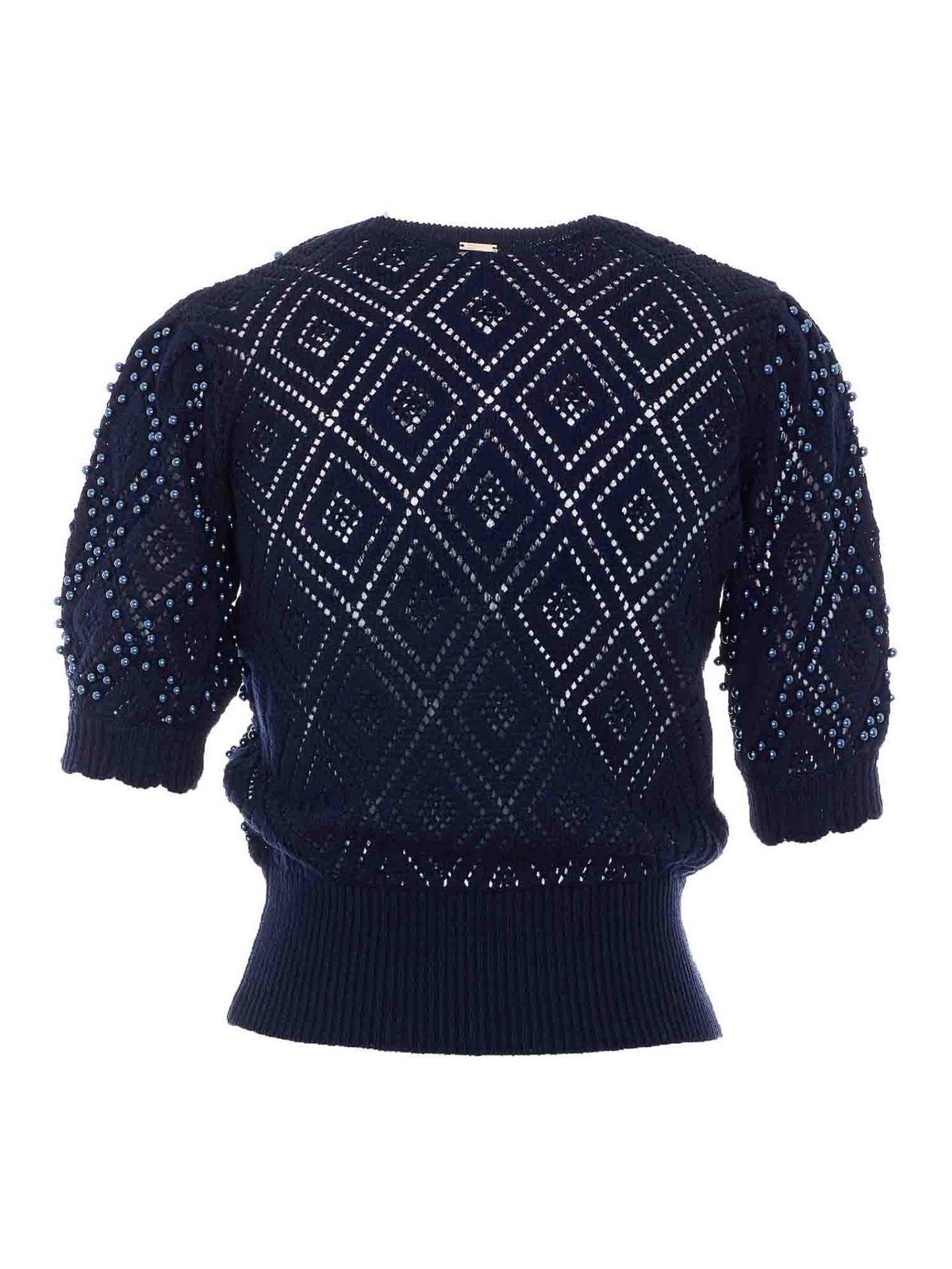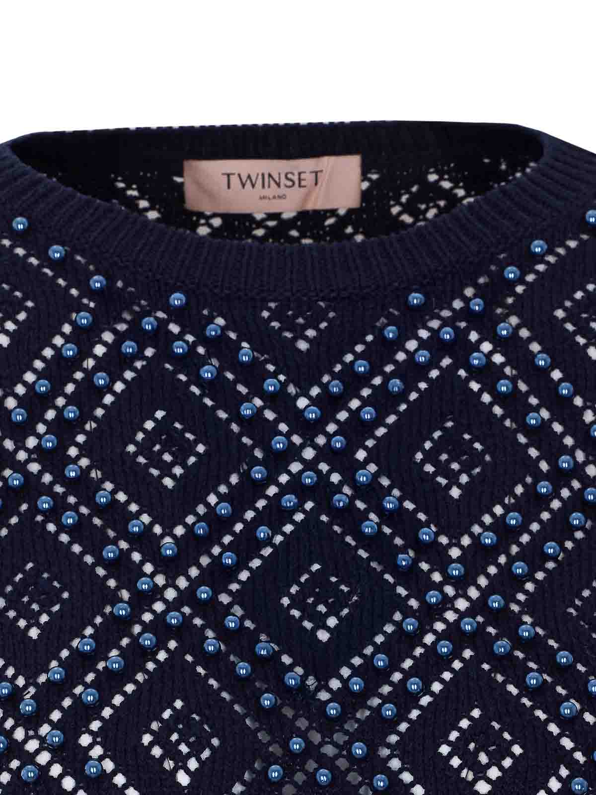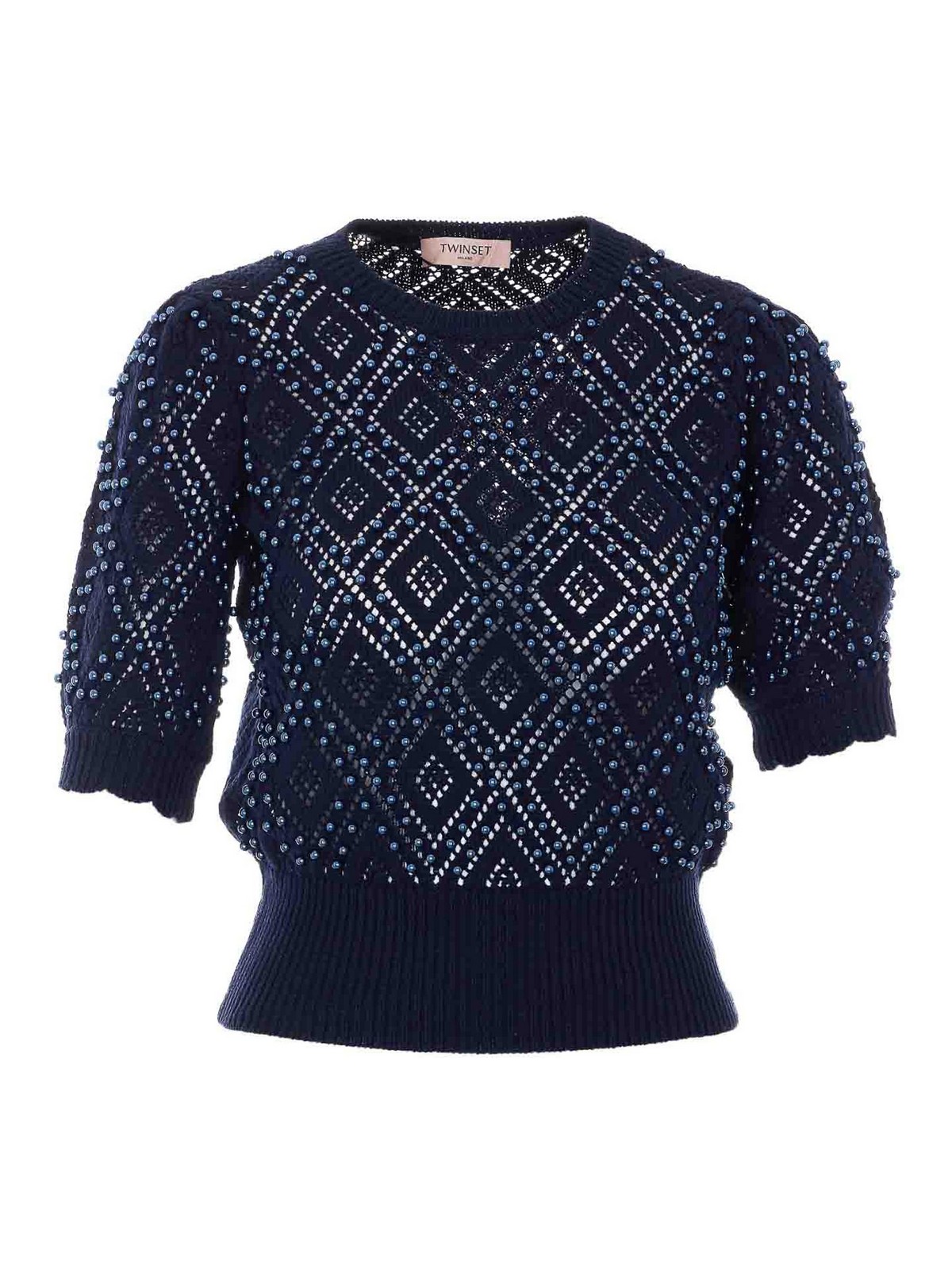 Blaues Twinset-T-Shirt, Rundhalsausschnitt, durchgehendes Perlendetail, Strickeffekt