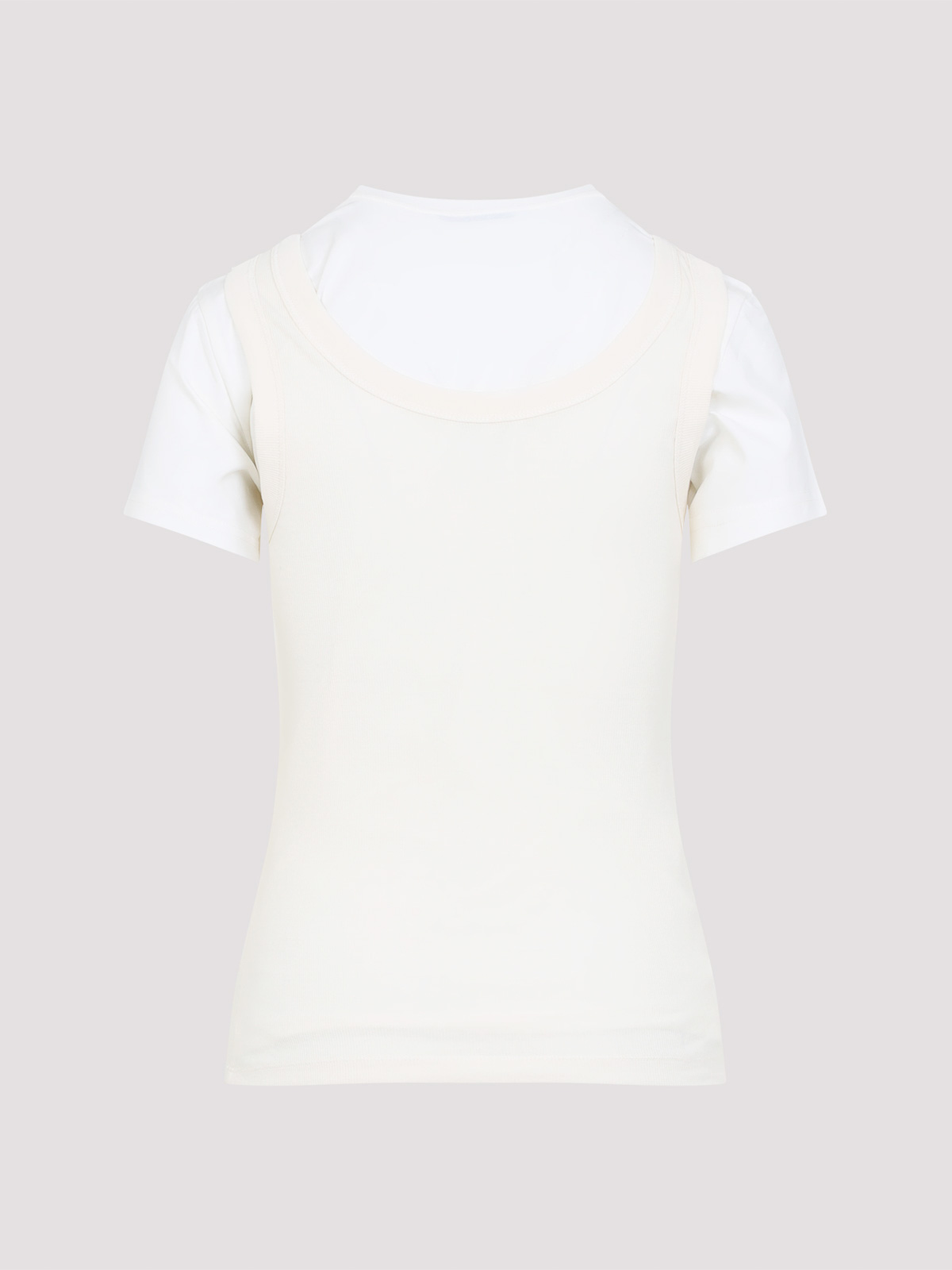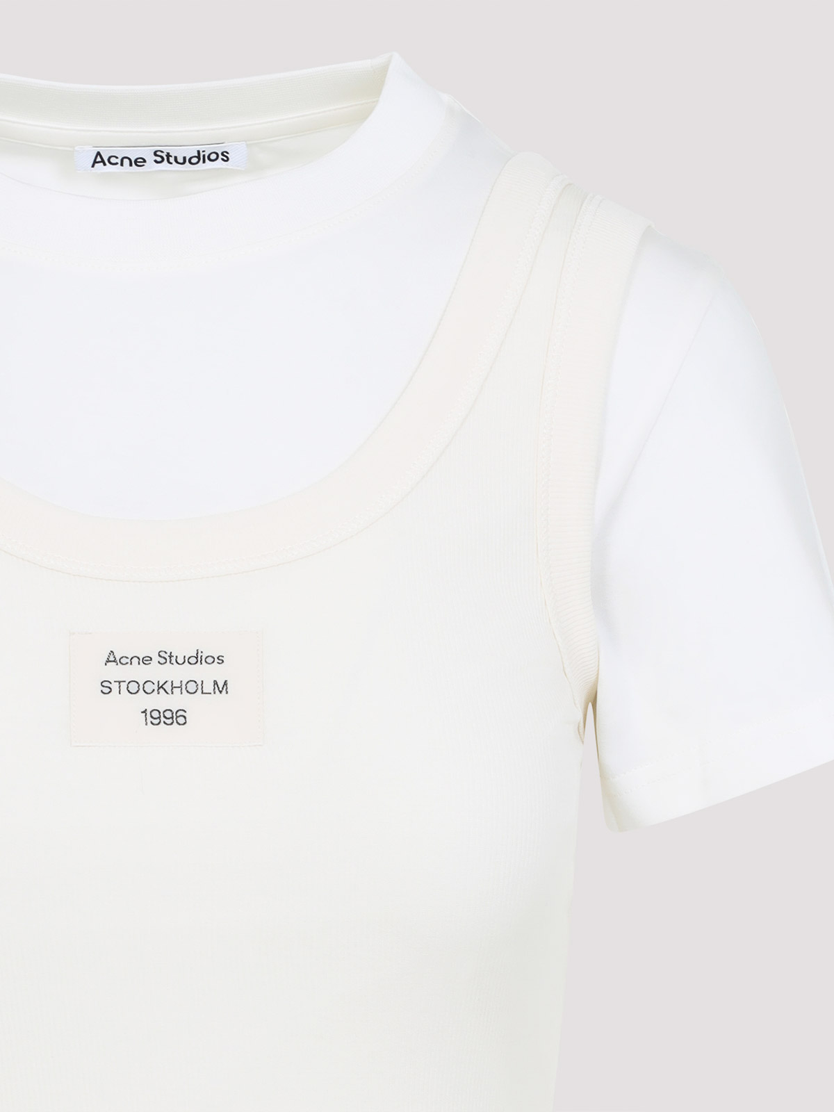Cremefarbenes T-Shirt von Acne Studios aus Baumwolle und Elastan. Mehrlagiges Design, Rundhalsausschnitt, kurze Ärmel, cremeweißes Tanktop, Logo-Patch auf der Brust.