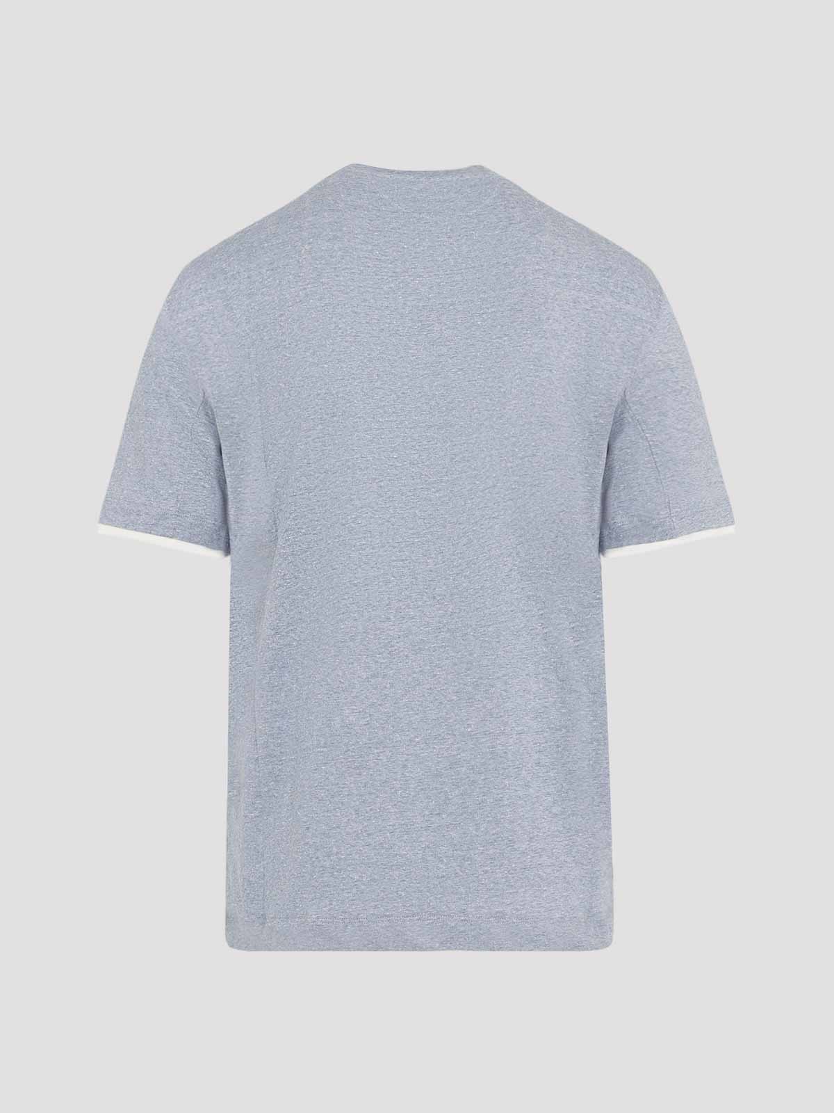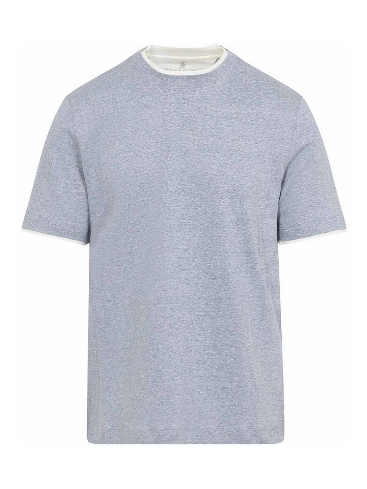 Zweifarbiges hellblaues Baumwoll-T-Shirt von Brunello Cucinelli. Hergestellt aus hellblauer Mlang-Baumwolle, mit Kunstlayern, rundem Ausschnitt, kurzen Ärmeln und geradem Saum.