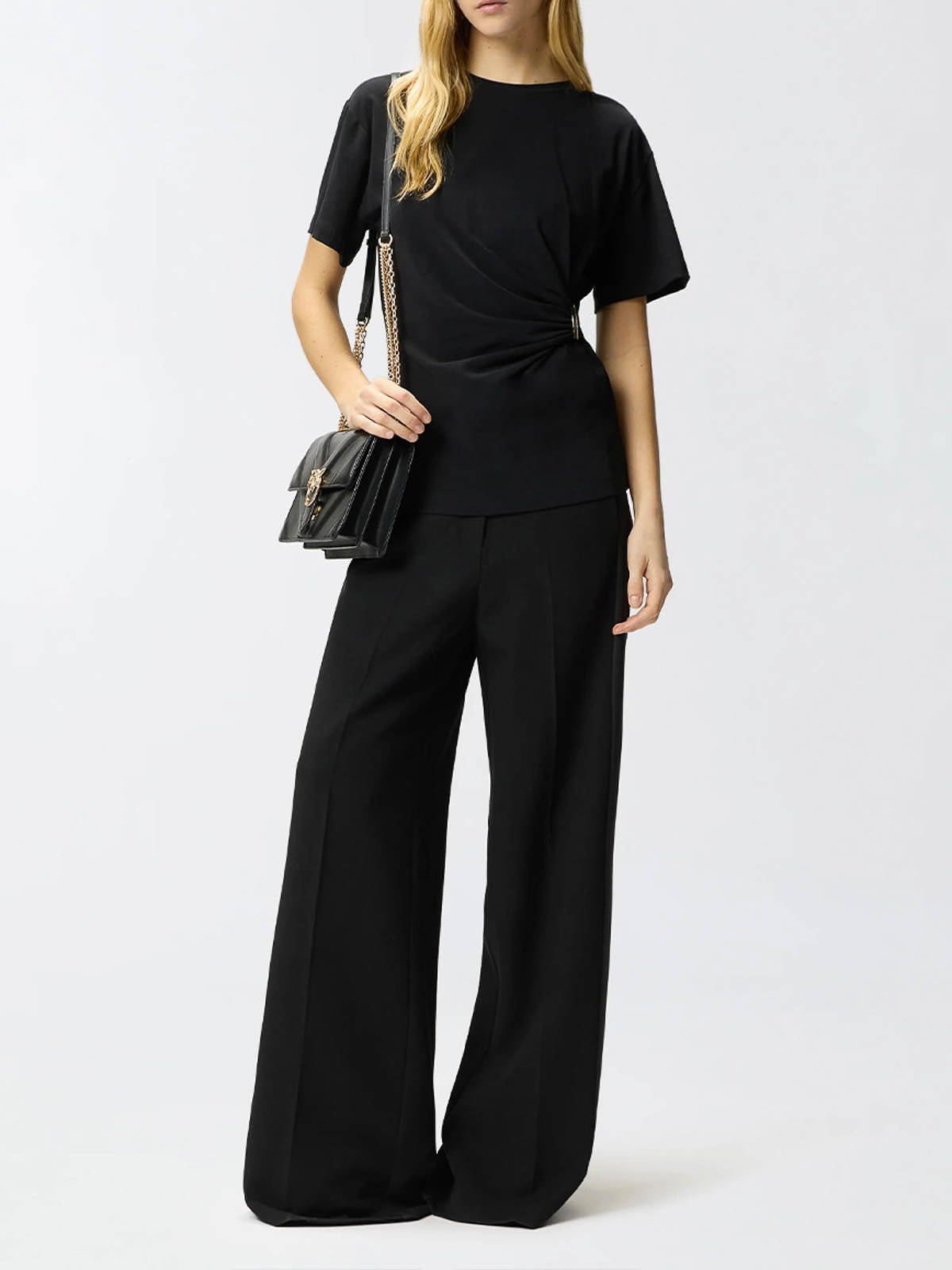 Pinko Kurzarm-T-Shirt mit Rundhalsausschnitt aus elastischem Interlock aus Supimabaumwolle und einer goldenen Applikation an der Taille, die für ein raffiniertes Drapieren auf der Vorderseite sorgt.