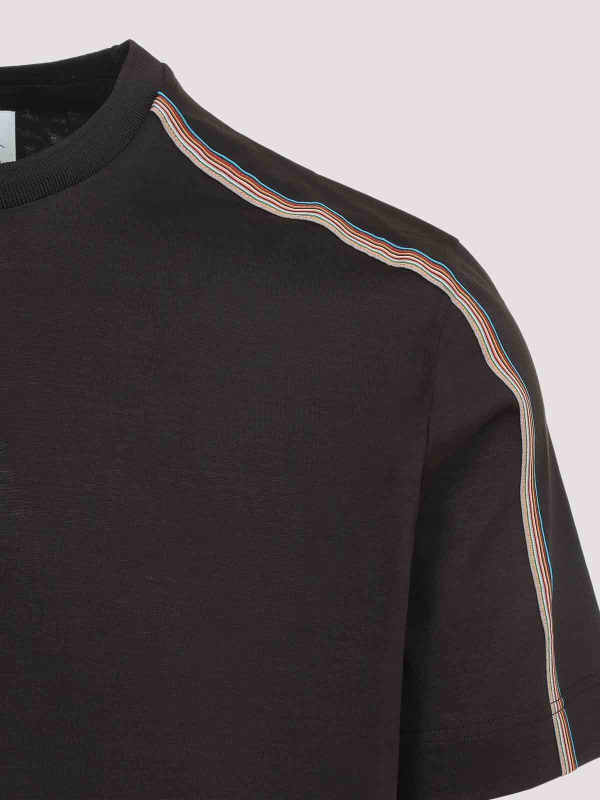 Paul Smith Schlammbraunes Baumwoll-T-Shirt mit Streifendetail. T-Shirt aus reiner Baumwolle, Rundhalsausschnitt, mehrfarbiges Streifenband an den Schultern, kurze Ärmel, gerader Saum.