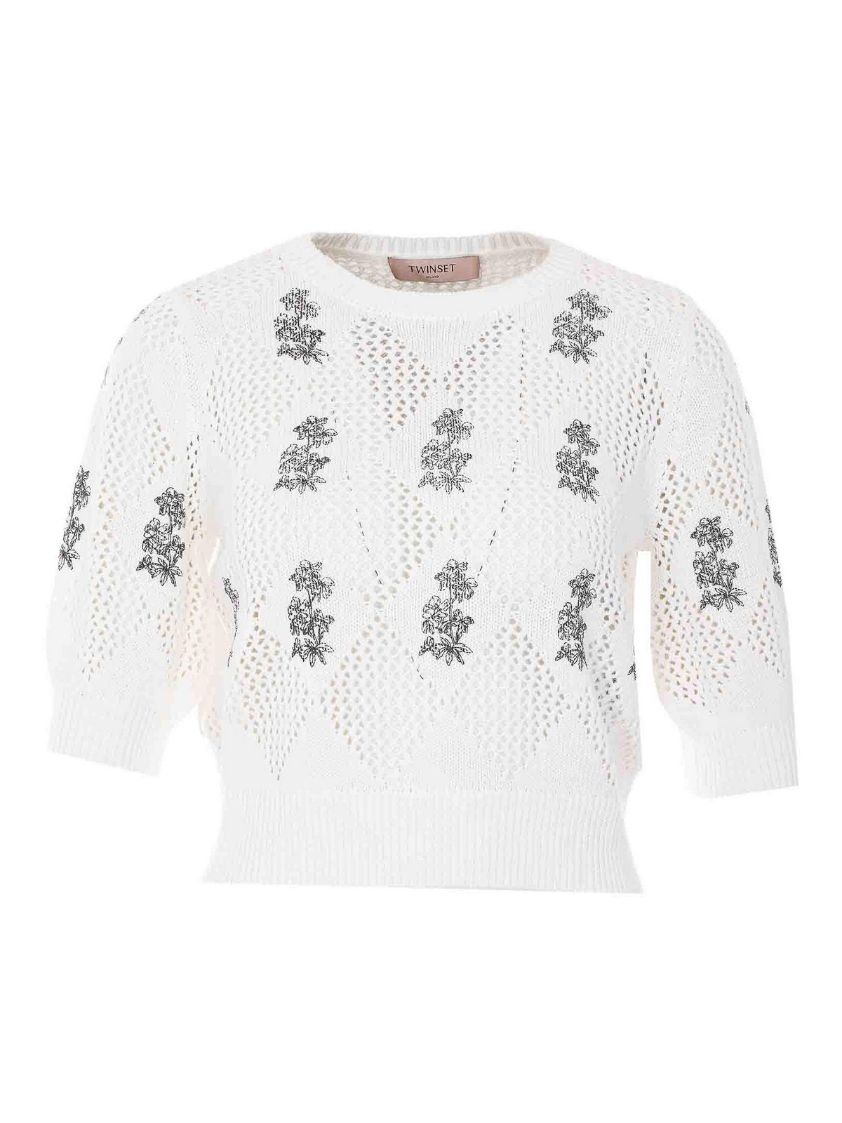 Weißes Twinset-T-Shirt, Rundhalsausschnitt, kurze Ärmel, gestickte Details
