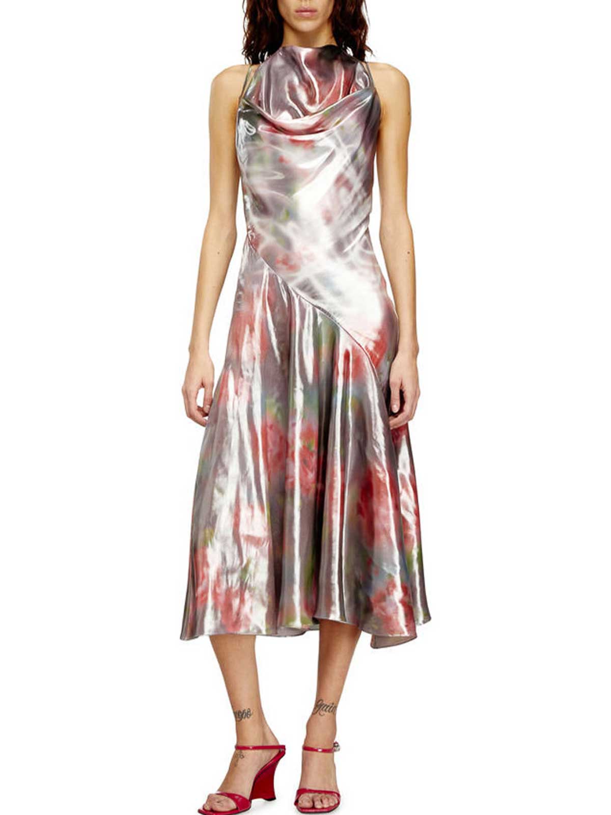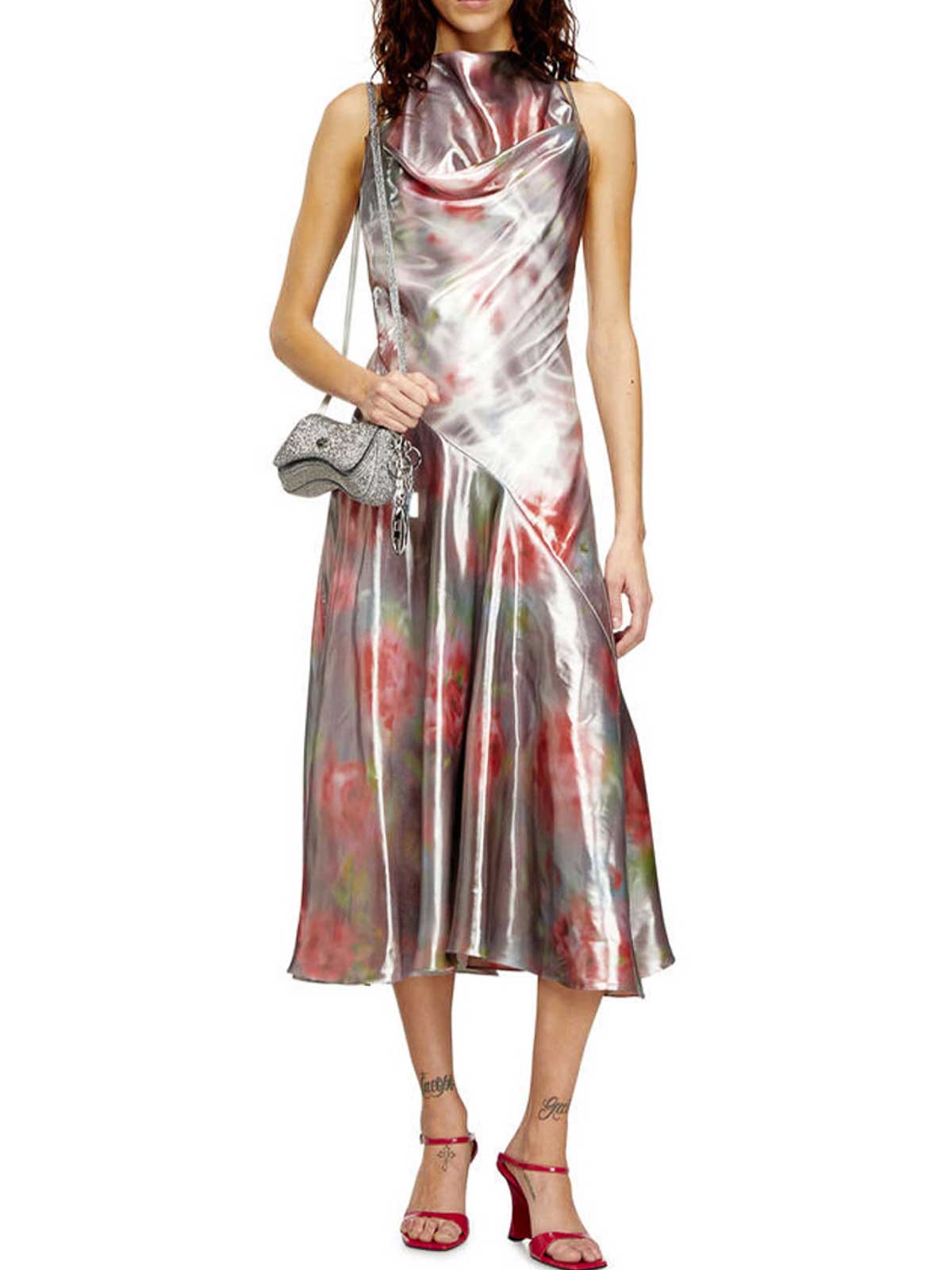 Diesel Midikleid aus Georgette bedruckt mit verschwommenen Rosen. es ist schräg geschnitten und fällt fließend über den Körper, fängt das Licht mit einem metallischen Wet-Look-Effekt ein. Der Neckholder-Ausschnitt mit Bindebändern macht das Kleid verstellbar, während das dünne