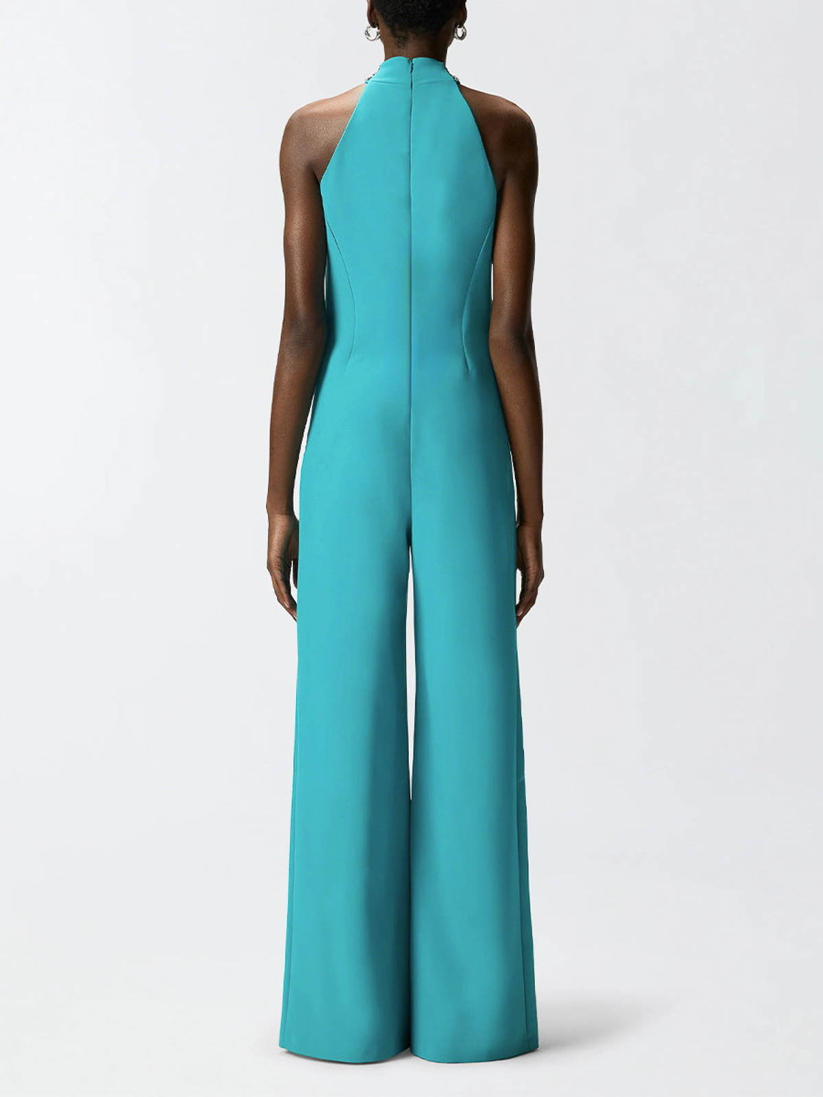 Langer Jumpsuit mit Neckholder und Pinko-Schmuckdetail mit geradem Hosenbein aus technischem Canvas-Gewebe und gefüttert mit leichtem Georgette, ärmelloses Top mit einem raffinierten Neckholder-Ausschnitt verziert mit einem dezenten senkrechten Ausschnitt an der Vorderseite und
