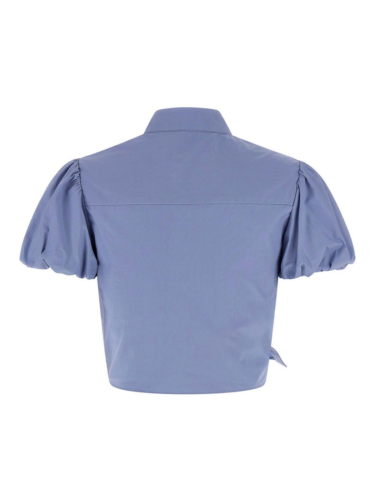 blaues Crop-Top aus Baumwolle mit Bindeband aus Baumwolle mit asymmetrischem Druckknopfverschluss auf der Vorderseite mit Knoten am Saum, Stehkragen, Brusttasche, abnehmbarer Miederbrosche und kurzen Ballonärmeln.