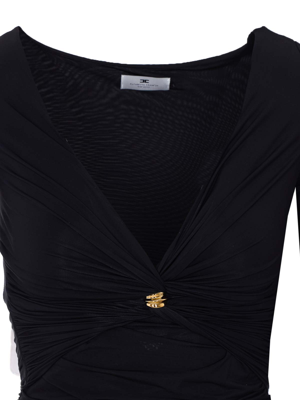 Elisabetta Franchi Oberteil mit schwarzen Rüschen, V-Ausschnitt, Plakettendetail auf der Vorderseite, lange Ärmel, elastische und eng anliegende Passform