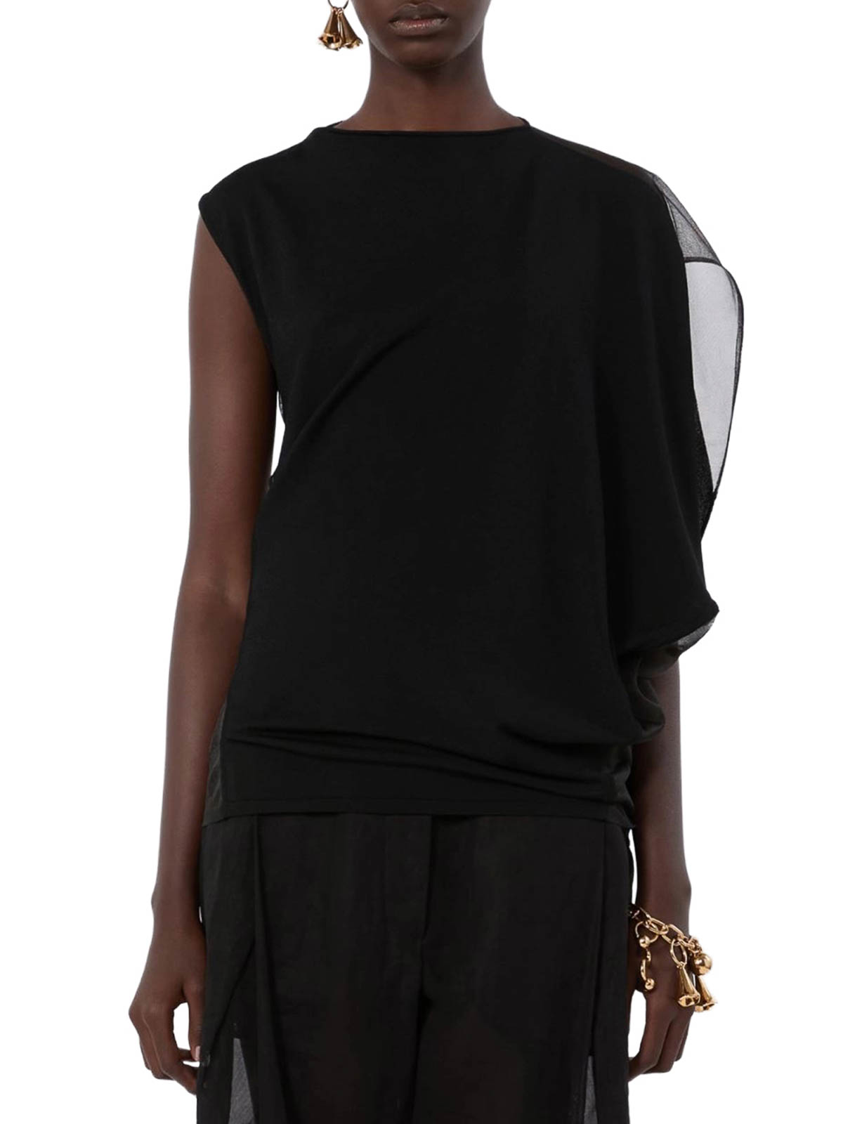 Stretchstricktop, Einsätze aus transparentem technischem Garn, asymmetrischer Ausschnitt, Wickelkonstruktion mit drapierter Vorderseite, durchsichtige Strickeinsätze, reguläre Passform, das Model trägt Größe M und ist 178 cm groß, Farbe: schwarz