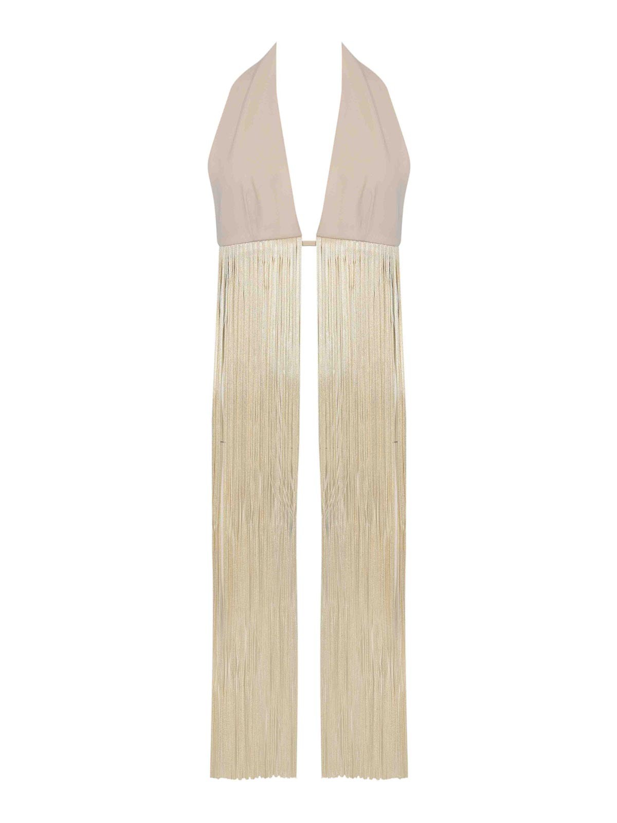 Damen-Top aus Crêpe, Patrizia Pepe, Material: Krepp mit Fransenapplikation, Muster: einfarbig, Ärmel: ärmellos, Kragen: tiefer V-Ausschnitt, Verschluss: verstellbare Rückenschnürsenkel, Taschen: nicht vorhanden, Details: offenes Design auf der Vorderseite mit Mittelsteg, unterer Teil mit langen Fransen verziert, Schnürsenkel mit.mes tallfliegenenden, Passform: regulär