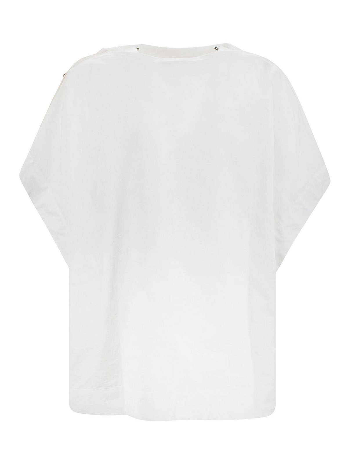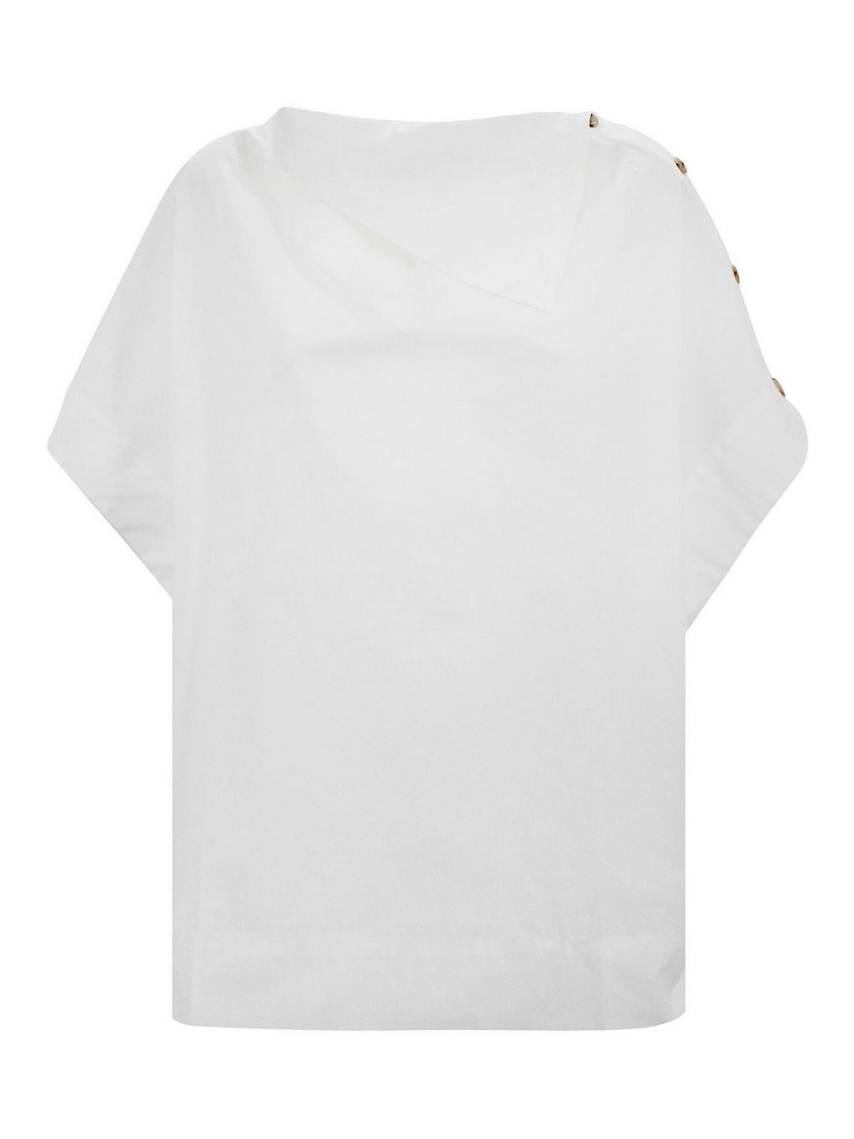 U-Boot-Ausschnitt mit asymmetrischem Detail, kurze Ärmel, Knopfdetail an einem Ärmel, kastenförmige Passform, 100% Bio-Baumwolle.