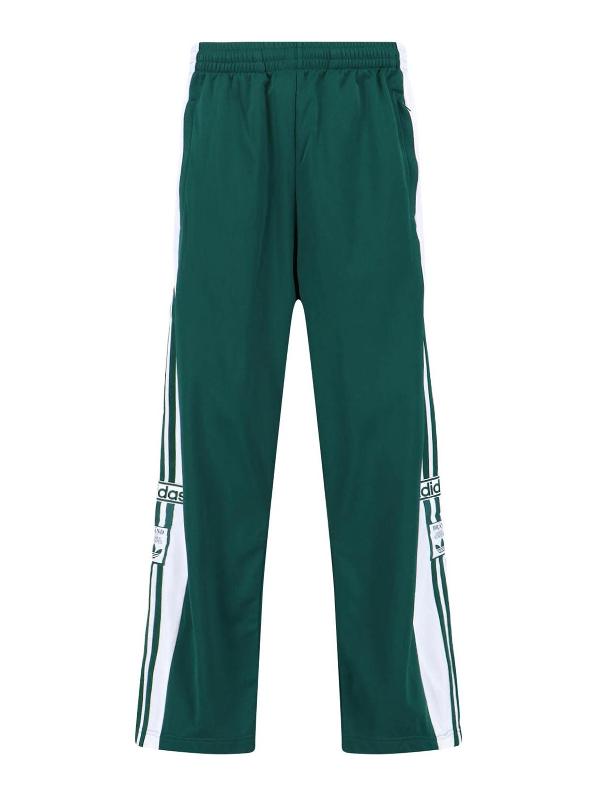 Adidas Adibreak Sporthose aus grünem Stoff, mittelgroßer elastischer Bund, zwei seitliche Reißverschlusstaschen, seitliche Knöpfe, kontrastierende ikonische Bänder, Logo-Patch, gerades Bein.
