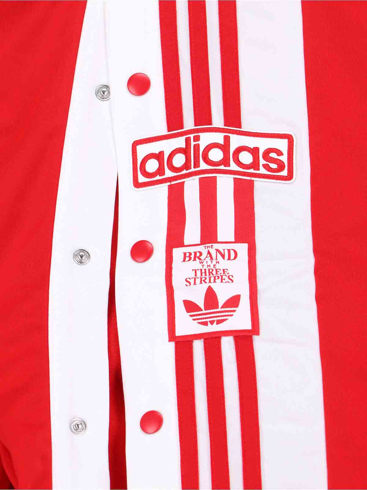 Adidas Adibreak Sporthose aus rotem Stoff, elastischer mittlerer Bund, zwei seitliche Reißverschlusstaschen, kontrastierende ikonische Seitenbänder, seitliche Knöpfe, seitlicher Logo-Print, gerades Bein.
