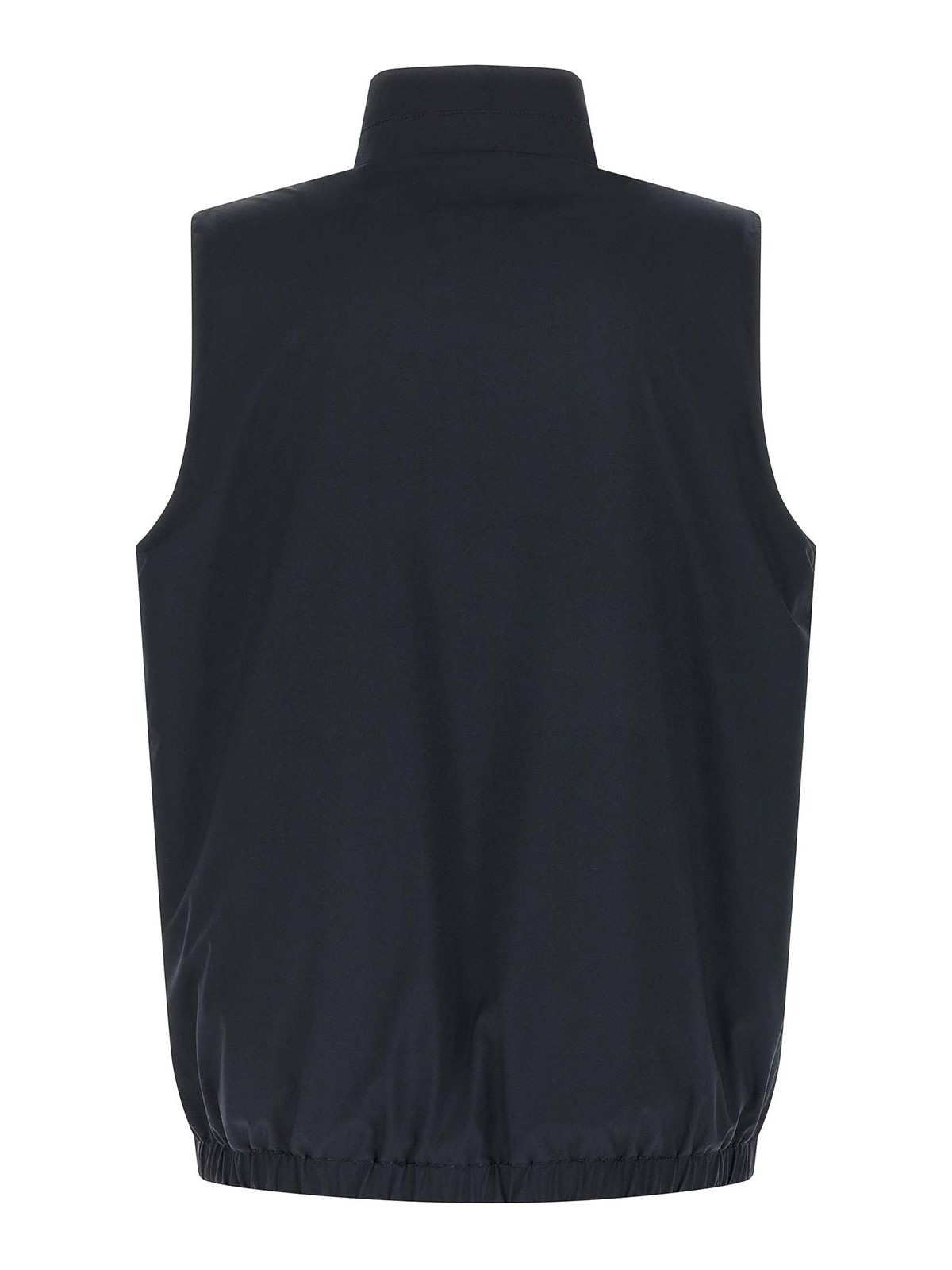 Doppelseitige Weste aus Nylon- und Baumwolljersey, Stehkragen, Frontreißverschluss, Logo-Puller aus emailliertem Metall, Seitentaschen, elastischer Saum.
