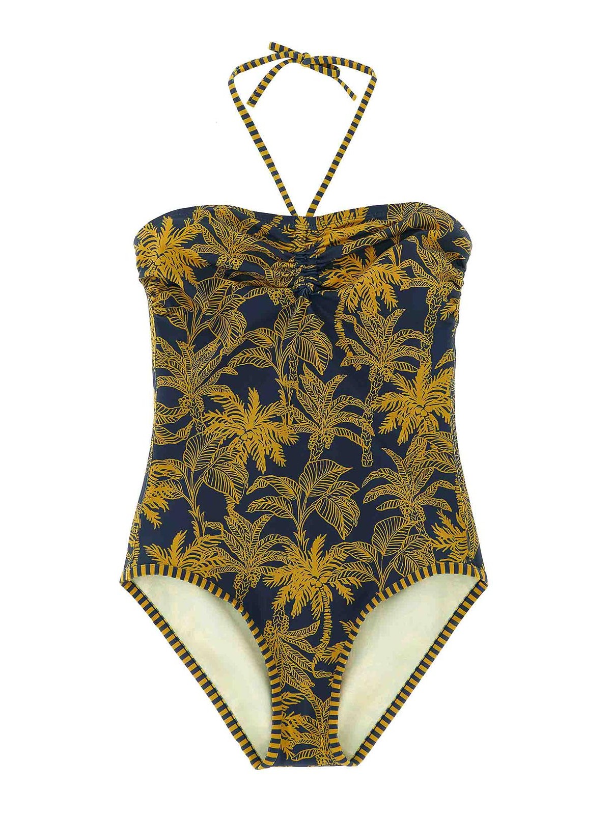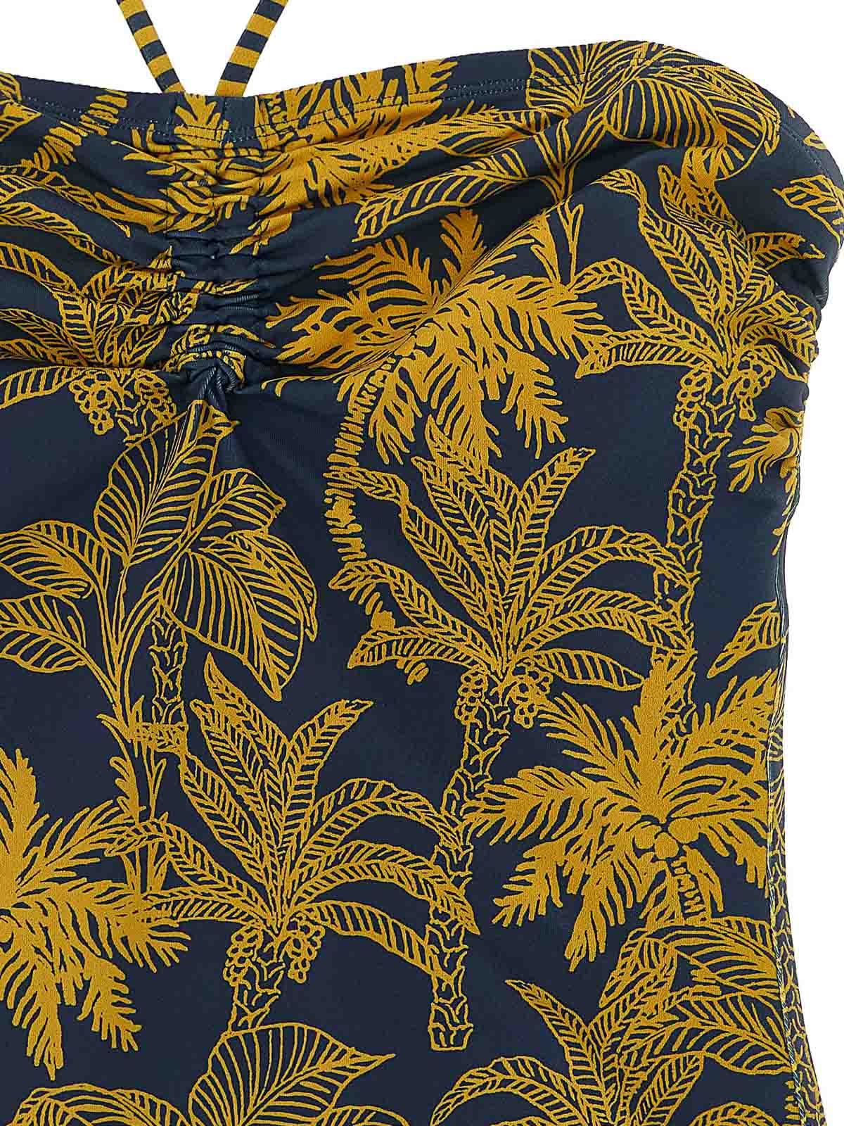 ailleurs' one-piece swimsuit in peau douce* fabric with 'voyage ocean' pattern, off-the-shoulder corset-style style, tie to be tied at the back of the neck with front pleats, classic cover.