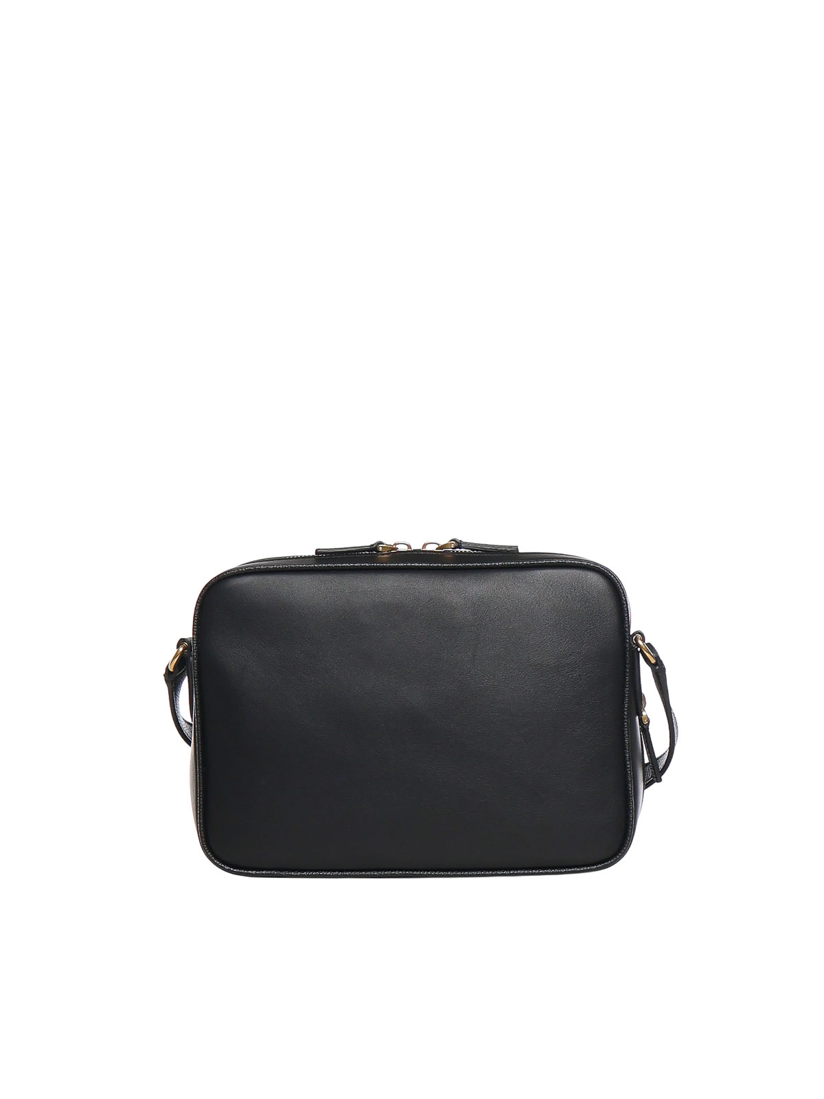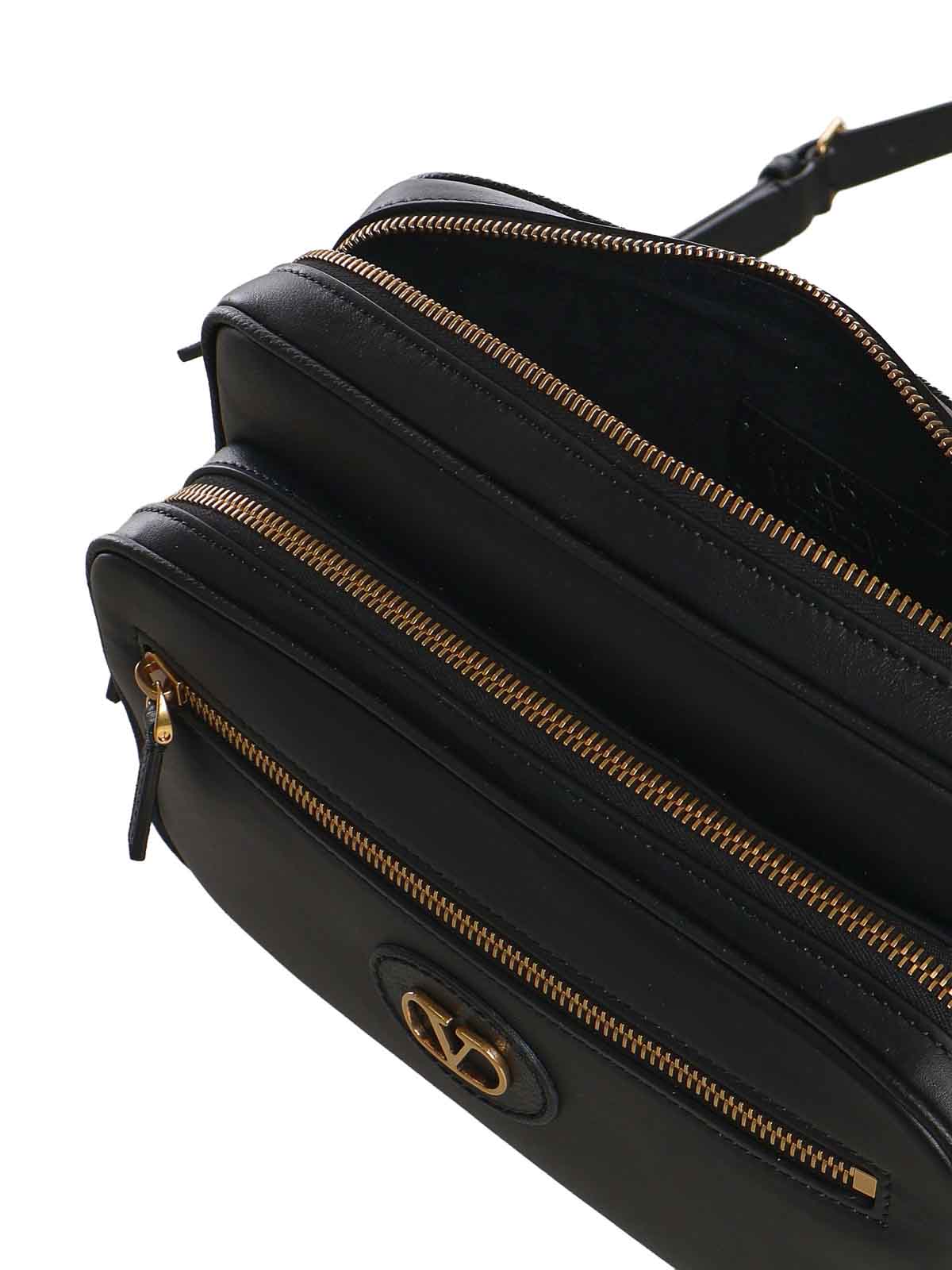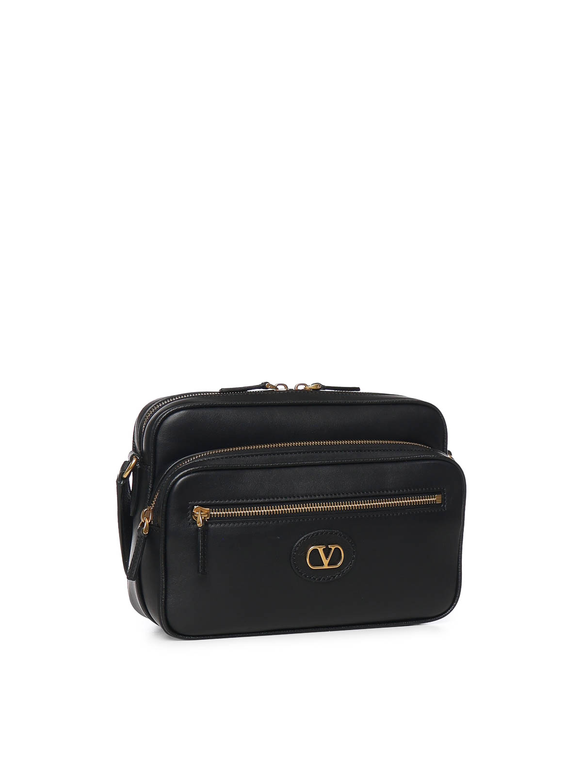 made of calfskin, double zip compartment, front pocket with vlogo signature patch, made in italy, dimensions: 24 x 17 x 7.5 cm, color: black