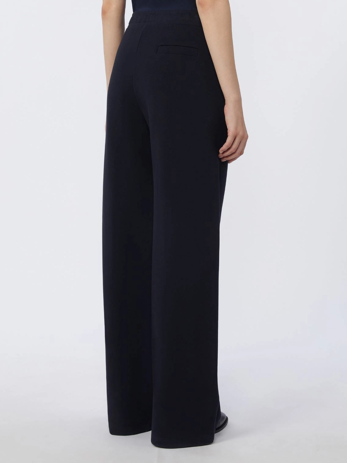 Navy blue trousers wide leg elastic waist with jacquard drawstring inset side pockets welt pocket on the back worn on the right side