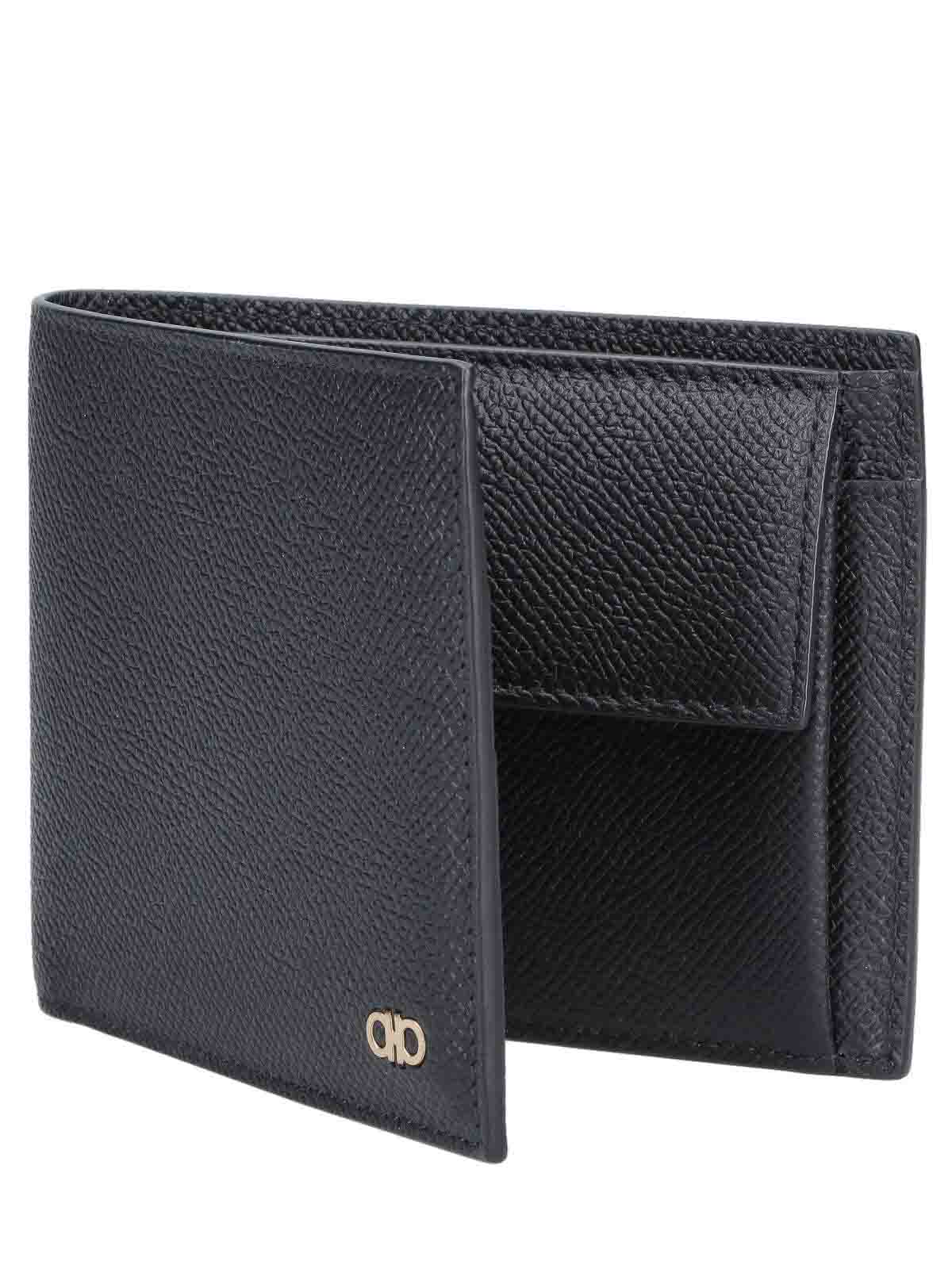 Ferragamo gancini bi-fold wallet in black calfskin, four card slots, one flap coin pocket, banknote slot.