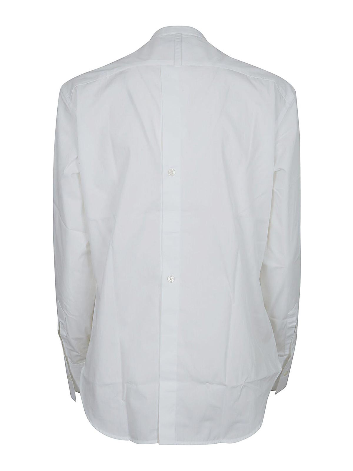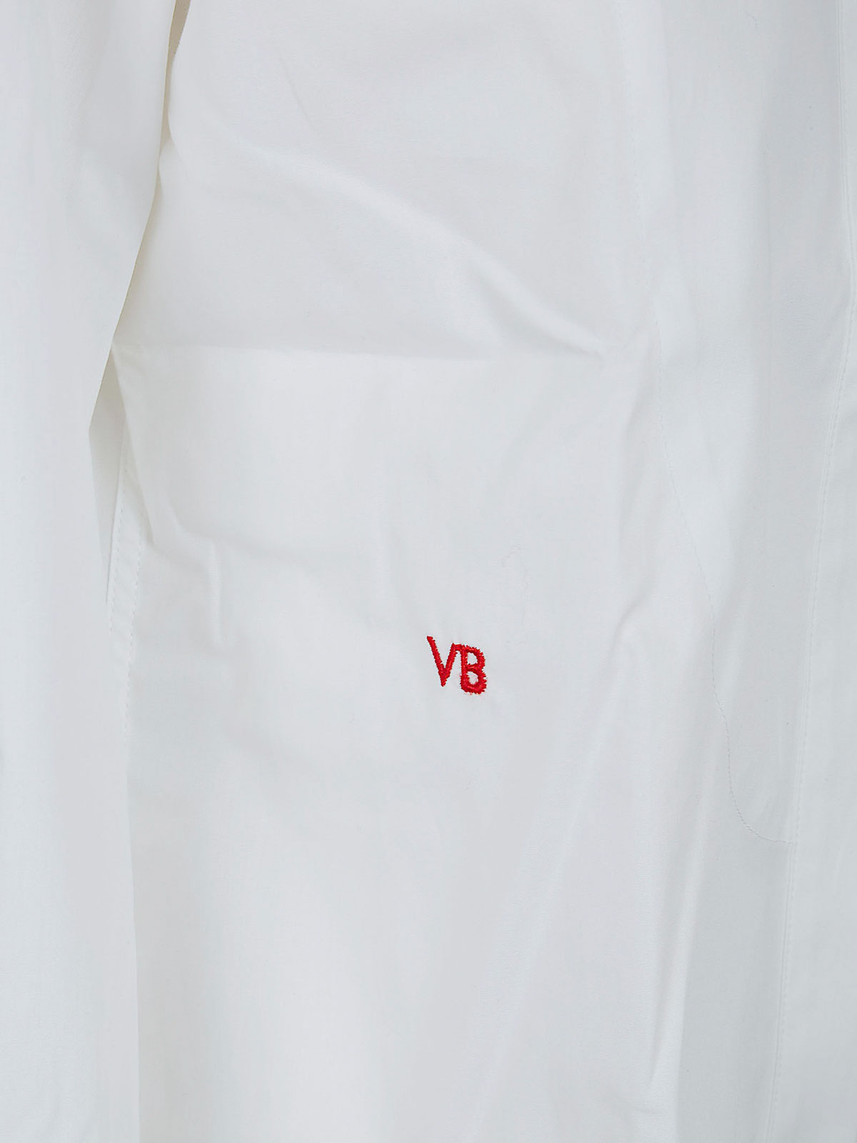 Poplin shirt by Victoria Beckham design interpretation of the tuxedo style rear buttoning cuff with single button characterized by front bib rear carr a flap with buttons on the back and Victoria Beckham monogram embroidered on