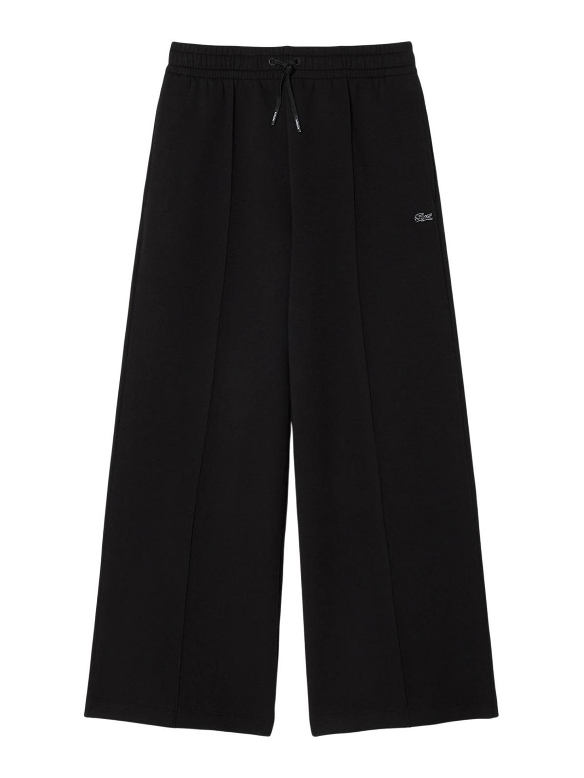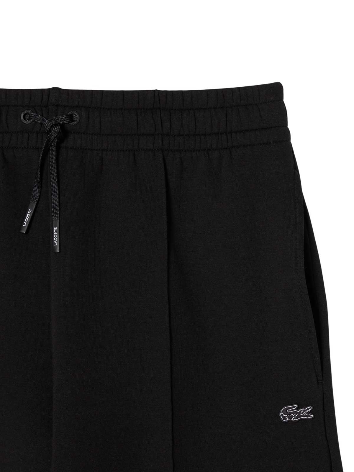 Lacoste sweatpants in black wide fit jersey, Lacoste sweatpants that express a refined balance between fashion style and sportswear DNA. Made of double-sided cotton blend jersey, they have a comfortable structure and a loose, fluid cut. the sartorial details, such as the needle-stitched pleats on the front, elevate the aesthetics of the garment, while the tone-on-tone embroidered crocodile discreetly signs the design. double-sided jersey in organic cotton and recycled polyester wide fit with wide leg comfortable and relaxed cut elasticated waist with adjustable drawstrings two side pockets needle-stitched pleats on the front tone-on-tone crocodile embroidery with contrasting stitching on the left leg, composition, cotton: 75% polyester: 20% elastane: 5%