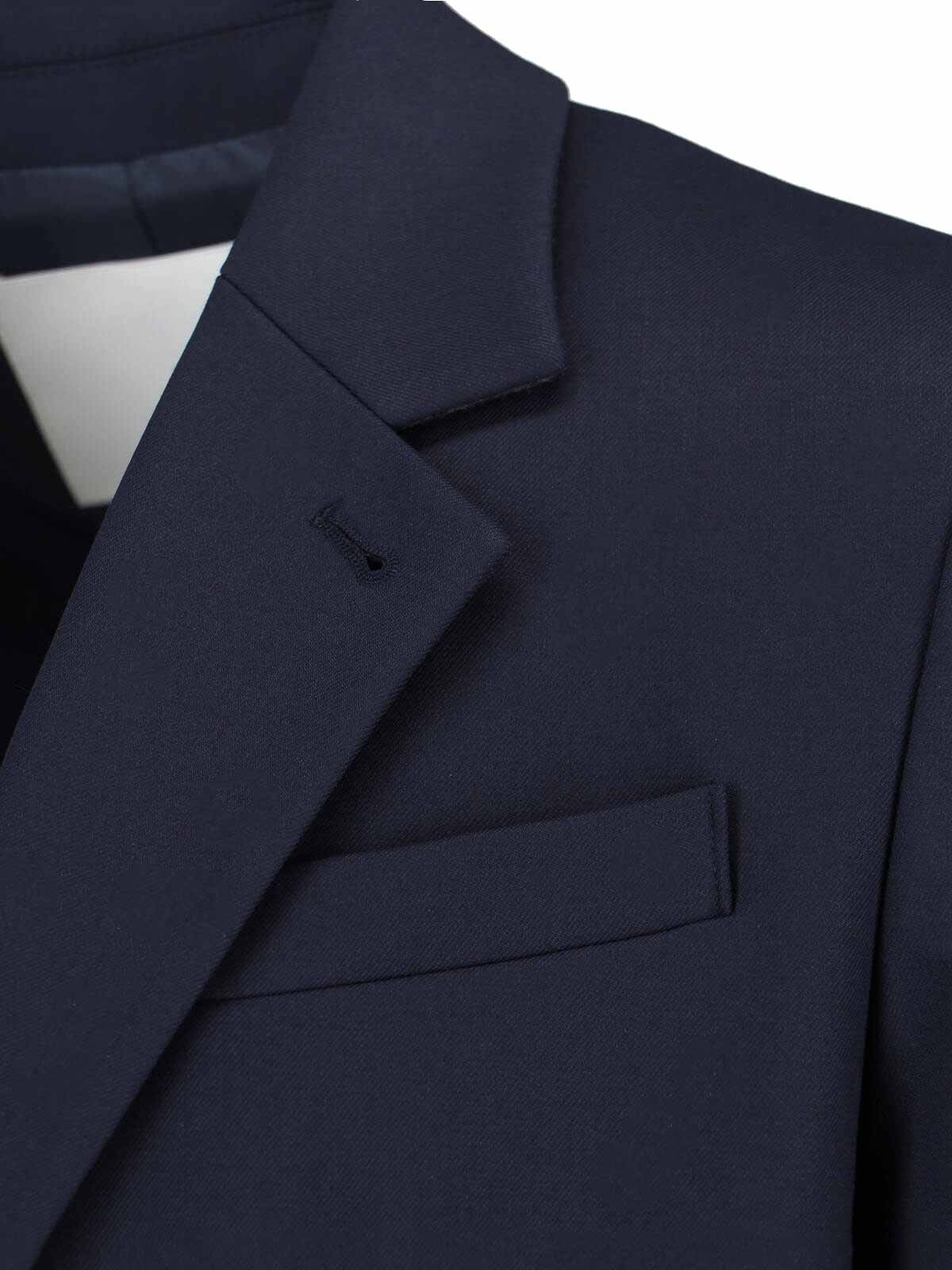 Dunst single-breasted blazer in blue wool blend, navy tone, lapels, long sleeves, single-breasted front button closure, two front flap pockets, one chest welt pocket, buttoned cuffs, curved hem.