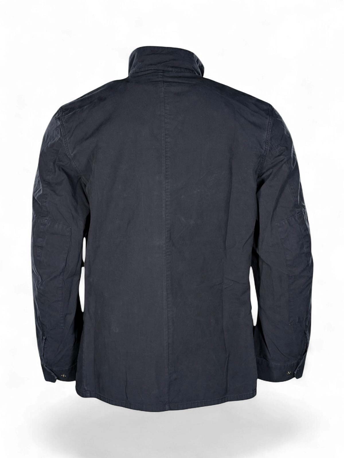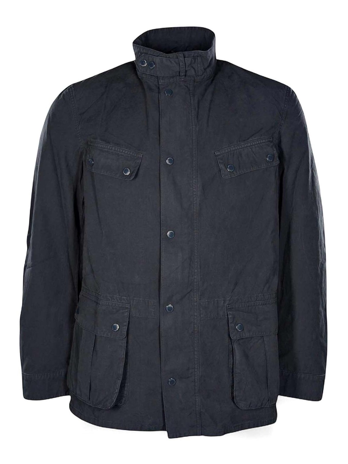 Barbour international, duke, casual garment-dyed jacket, blue, duke jacket with an iconic design by barbour international, a versatile outerwear that combines heritage aesthetics and contemporary functionality. the model represents one of the classics of the b.intl collects ion, designed to complete casual men's looks with character. Made entirely of cotton and treated with garment dyeing to obtain an authentic worn effect, the jacket has a slightly slim fit that enhances the silhouette while maintaining comfort and practicality. the garment is characterized by a stand-up collar with chin strap and snap buttons, a front zip closure protected by a windproof flap and functional pockets that combine style and utility, a stand-up collar with chin strap and snap buttons, front zip closure and windproof flap, upper welt pockets, lower bellows pockets with box pleat and double opening, Barbour international embroidery on the left sleeve, garment-dyed treatment for a worn effect.