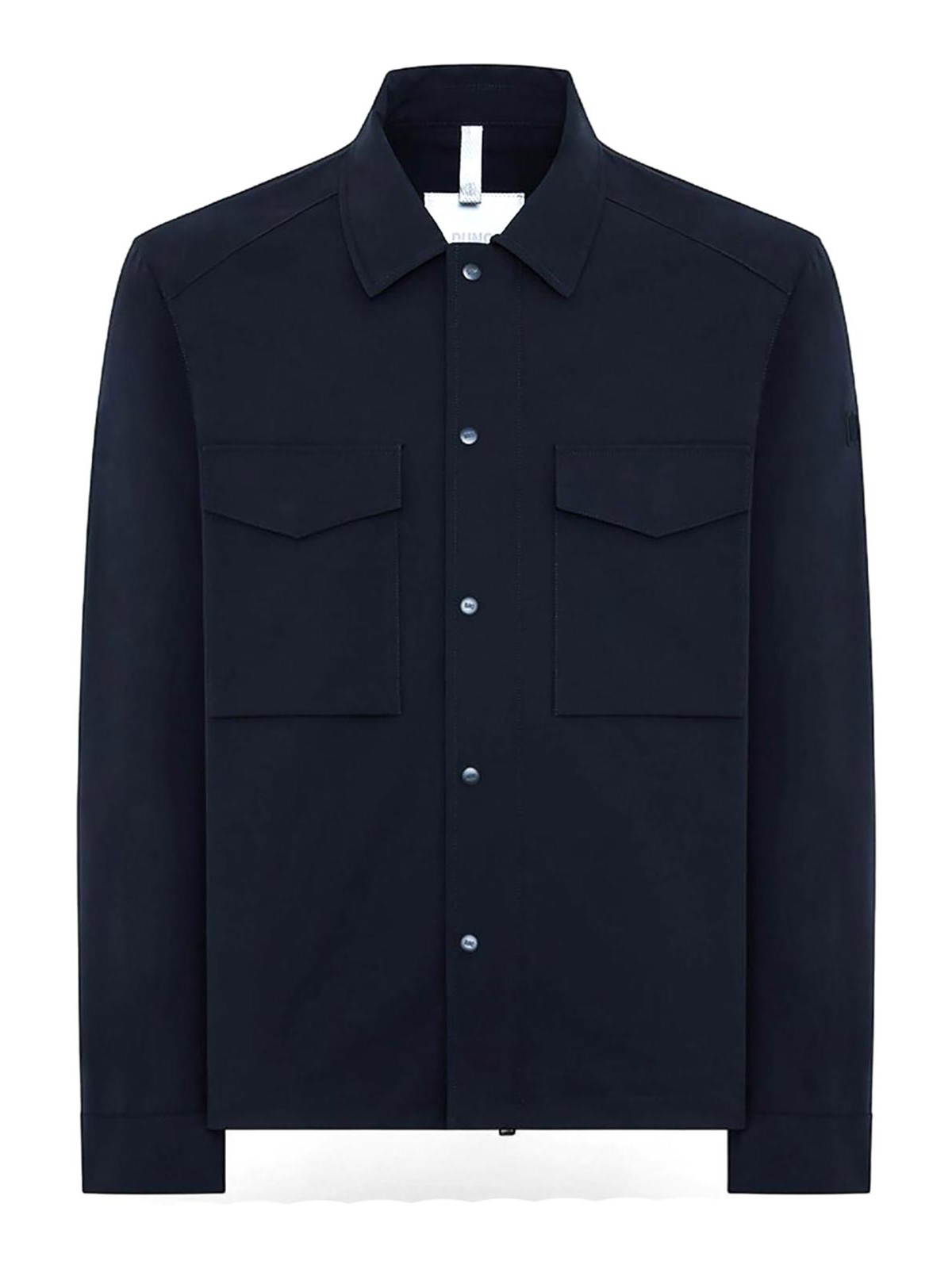 Duno artemis jacket in blue technical stretch fabric, artemis model jacket by duno, made of technical stretch fabric that combines lightness, comfort and formal cleanliness. the design recalls the contemporary overshirt shirt, with classic collar, front closure with snap buttons and patch pockets with flap on the chest. the stretch polyamide construction guarantees freedom of movement and a fluid fit, maintaining an essential and modern line. the buttoned cuffs and the minimal cut define its technical and refined aesthetic, ideal for mid-season and for dynamic urban use. stretch technical fabric classic collar front closure with snap buttons patch pockets with flap on the chest adjustable cuffs with button regular fit, fabric composition: 83% polyamide 17% elastane