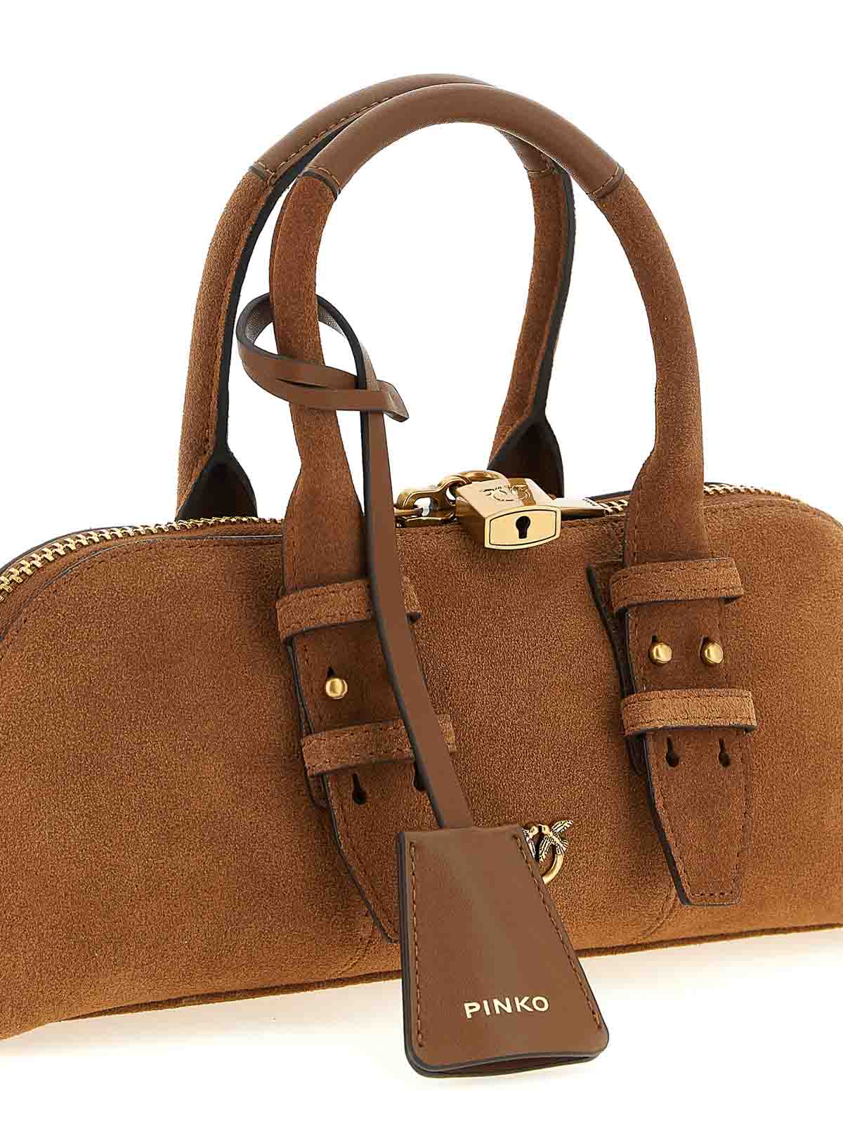 bowling baguette' suede shoulder bag, metal 'love birds' logo on the front and embroidered on the back, double adjustable handle, top zip closure with padlock detail, rigid base with metal feet, adjustable and removable shoulder strap.