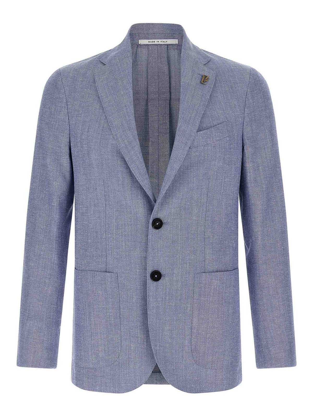 brera' single-breasted blazer in wool, cotton and linen blend with front button closure, mirror lapels with removable metal pin, chest pocket, patch pockets, unlined, two inner pockets, cuffs with opening buttonholes, back vents.