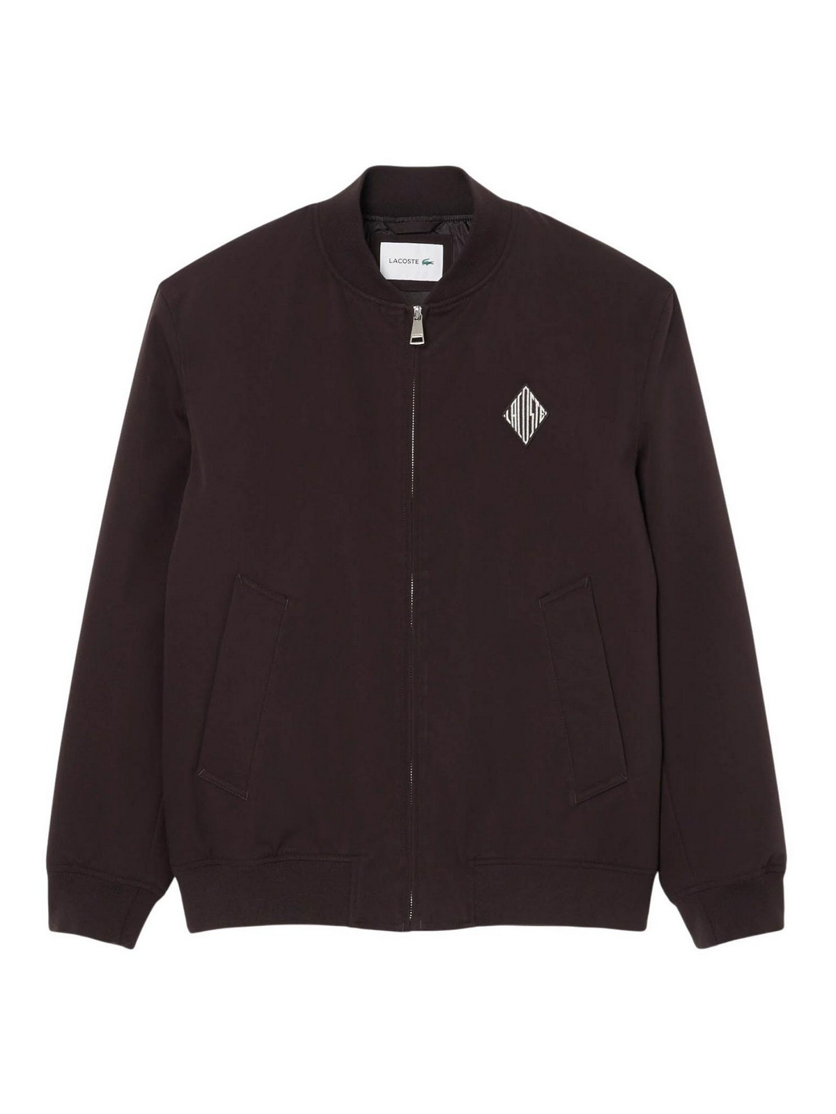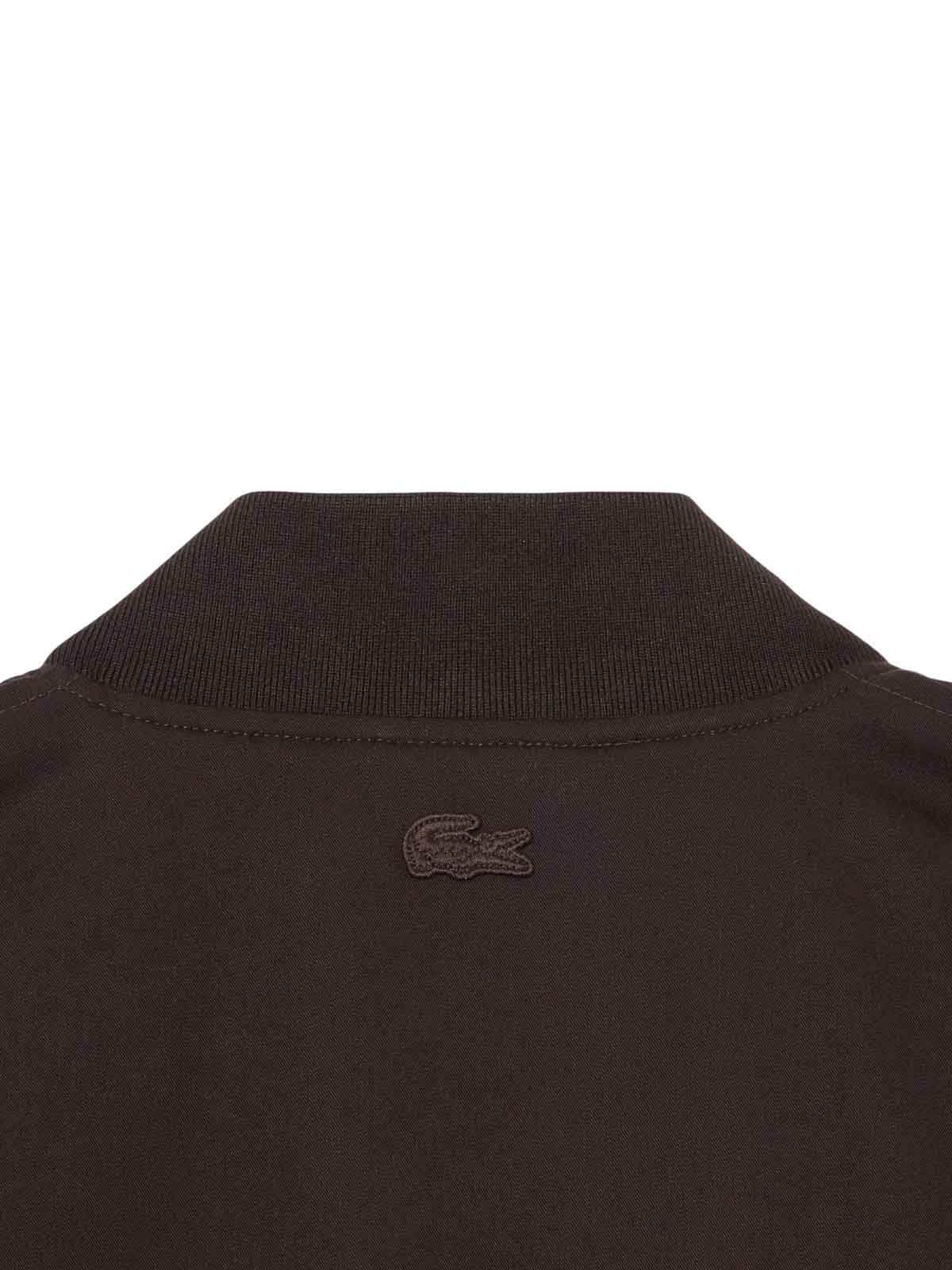 Lacoste waterproof bomber with brown retro emblem, this bomber combines elegance and Lacoste technical expertise in a garment with a t.mes less character. Made of lightly padded waterproof twill, it offers protection from the elements while maintaining a clean and refined design. the contrasting quilted taffet lining and the refined details, such as the emblem with rtro logo and the tone-on-tone embroidered crocodile, give identity and refinement to the model. waterproof and windproof twill in recycled cotton and polyester blend light padding for protection and comfort contrasting quilted taffet lining diamond logo badge on the chest central zip with personalized slider two side zip pockets and one internal zip pocket ribbed on the collar, cuffs and hem tone-on-tone crocodile embroidery under the collar on the back, composition, main fabric: 65% polyester, 35% cotton body padding: polyester 100% lining: 100% polyester ribs: 98% polyester, 2% elastane, garment care, machine wash at maximum 30c on a super delicate cycle do not bleach do not tumble dry iron at low temperature (maximum 110c) do not dry clean dry flat in the shade