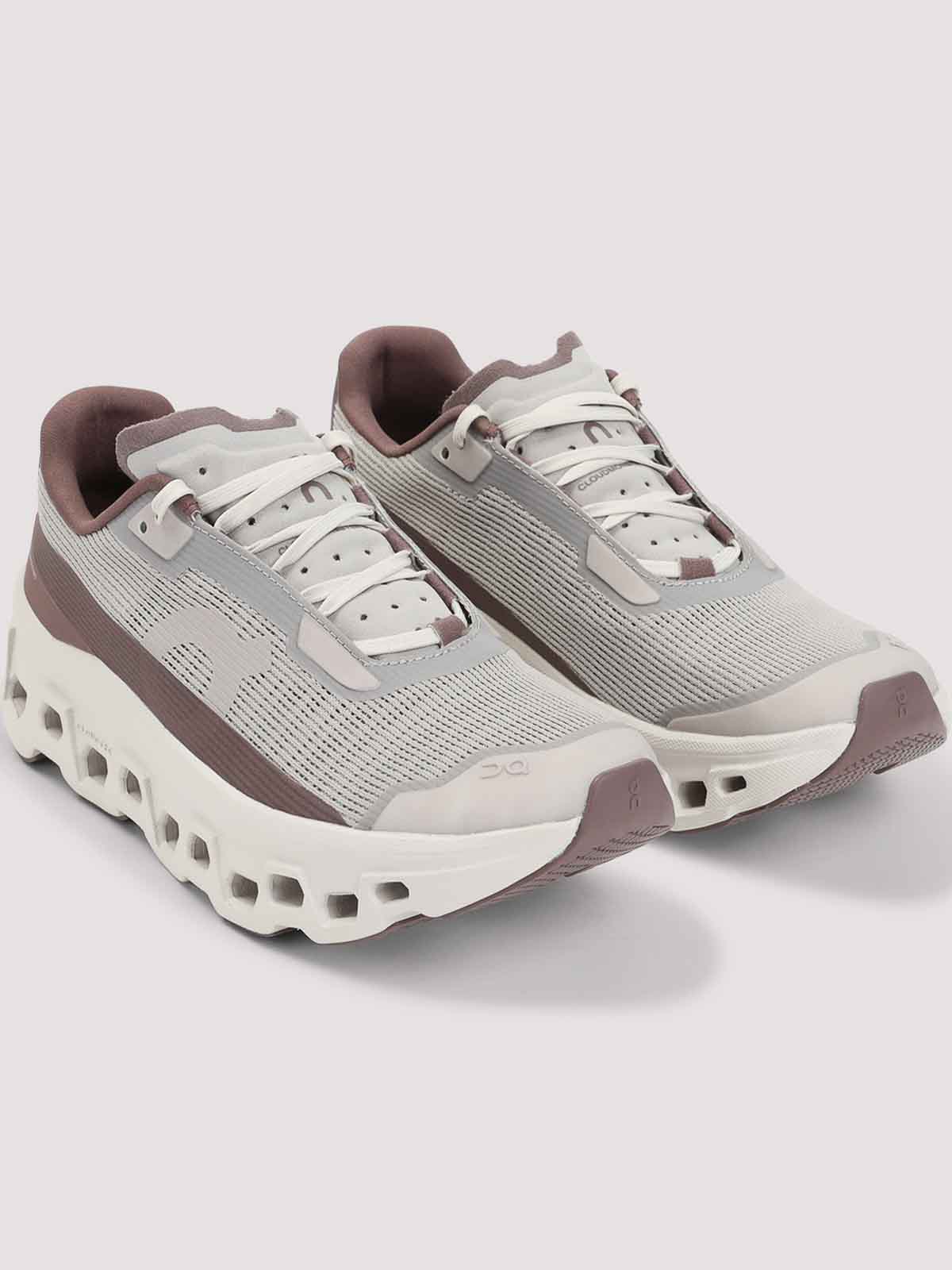 On cloudmonster voi purple textile sneakers. crafted from grey and purple mesh with purple and pink coated details on the vamp, featuring an almond toe, lace-up fastening, a logo stamped on the laser-cut tongue, a logo on the side, padded textile lining and insole, and the iconic perforated oversized outsole.